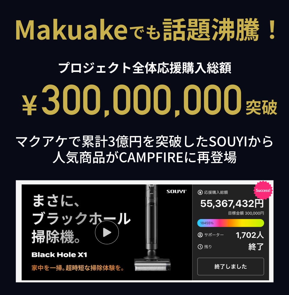2025/08/18 18:30こんにちは、ソウイジャパン株式会社です。いつも温かいご支援をありがとうございます。掃除の時間を“大幅削減”する5in1掃除機吸引・水拭き・除菌・乾燥・自動洗浄を1台で完結できるブラックホールは、掃除にかかる工程をまとめて自動化。これまで時間がかかっていた家の掃除も、短時間で効率的に終わらせられます。「やらなきゃ」をなくすテクノロジー・強力吸引でホコリを一掃・水拭きで床までピカピカ・除菌で清潔空間をキープ・乾燥で二度手間なし・自動洗浄で後片付け不要気づけば、家がキレイに。家族との時間をもっと増やそう「家事ゼロ時間」が叶えば、空いた時間を大切な人と過ごすことに使えます。掃除から解放されることで、暮らしに余裕が生まれます。今だけの特別価格でクラウドファンディング期間中だけの特別価格でご案内中です。「掃除に追われる日常」から「家事ゼロ時間」へ。ぜひ体験してください。\ 同時開催プロジェクトも要チェック /経済的×小型A4サイズ×拡張スライド!ペットボトル式の新型卓上ウォーターサーバー【驚異の水温9℃】2Lペットボトルをセットするだけでキンキンに冷えた水を給水できます! A4サイズのコンパクトボディなのに、大きめのマグカップやお鍋でも手軽に置ける独自の拡張スライド式トレー!欲しい時に欲しい量だけ、ムダ水ゼロで家計にやさしい設計。数量限定!一番お得に購入する▶︎64通りの微調整で毎日の1杯を特別にする本格コーヒー焙煎機進化した本格コーヒー焙煎機!温度・風力は1〜8段階、焙煎・冷却時間は10秒単位で調整可能。ガラス容器で焙煎の様子を確認しながら、自分好みに仕上げられます。初心者でも手軽に中煎りの本格コーヒーを楽しめるオート焙煎機能を搭載。数量限定!一番お得に購入する▶︎ もっと見る