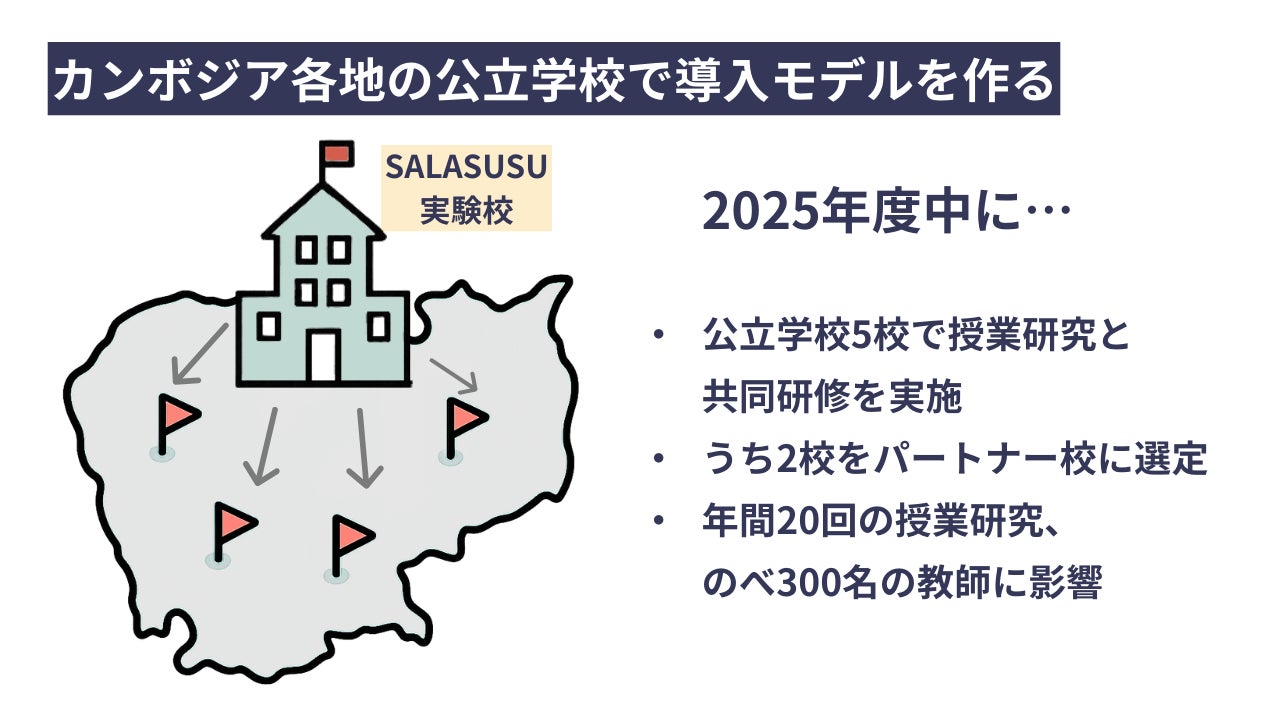 まずは2校の公立学校でモデル導入を進め、年間20回の授業研究を実施し、約300人の教師が参加予定です。2030までにモデル導入を最大8校まで拡大、教育省や教員養成校との連携を深めつつ、制度への組み込みを提案していきます。最終的に全国1万4000校のうち15%への拡大を目標としています。