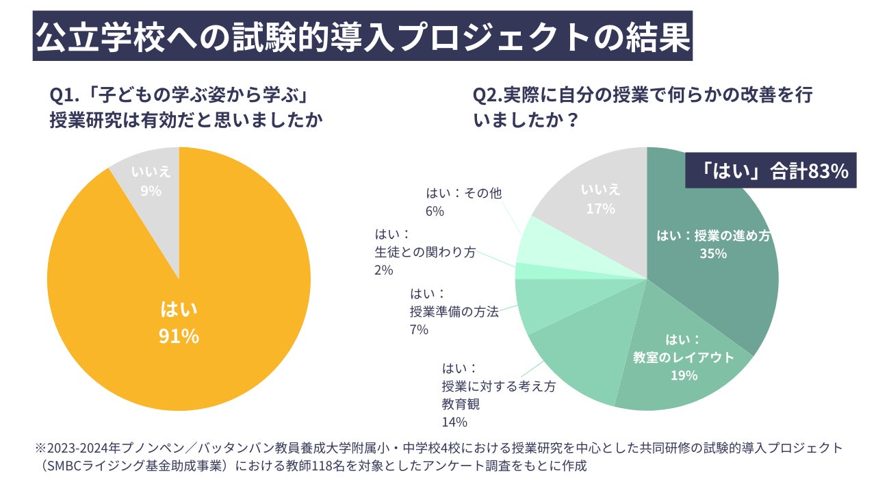 2023年から2024年にかけて実施した教員養成大学附属校での試験的導入プロジェクトでは、4校合計118名の教師に1年間に渡り合計11回の研修を実施したところ、90%以上の教師が「授業研究が有効である」、83%の教師が「実際に自身の授業を改善した」と回答しました。附属校は全公立学校のモデル校であり、ここでの取り組み結果は今後の展開に大変重要です。