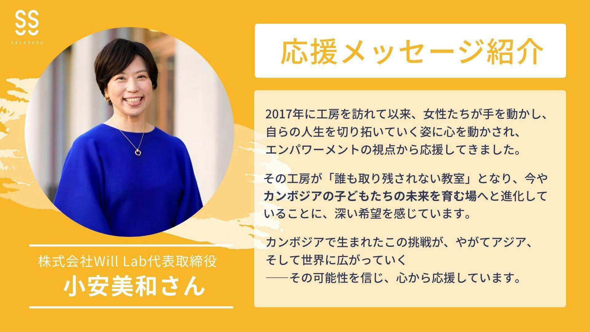 株式会社Will Lab代表取締役 小安美和さんから応援メッセージをいただきました。ありがとうございます!