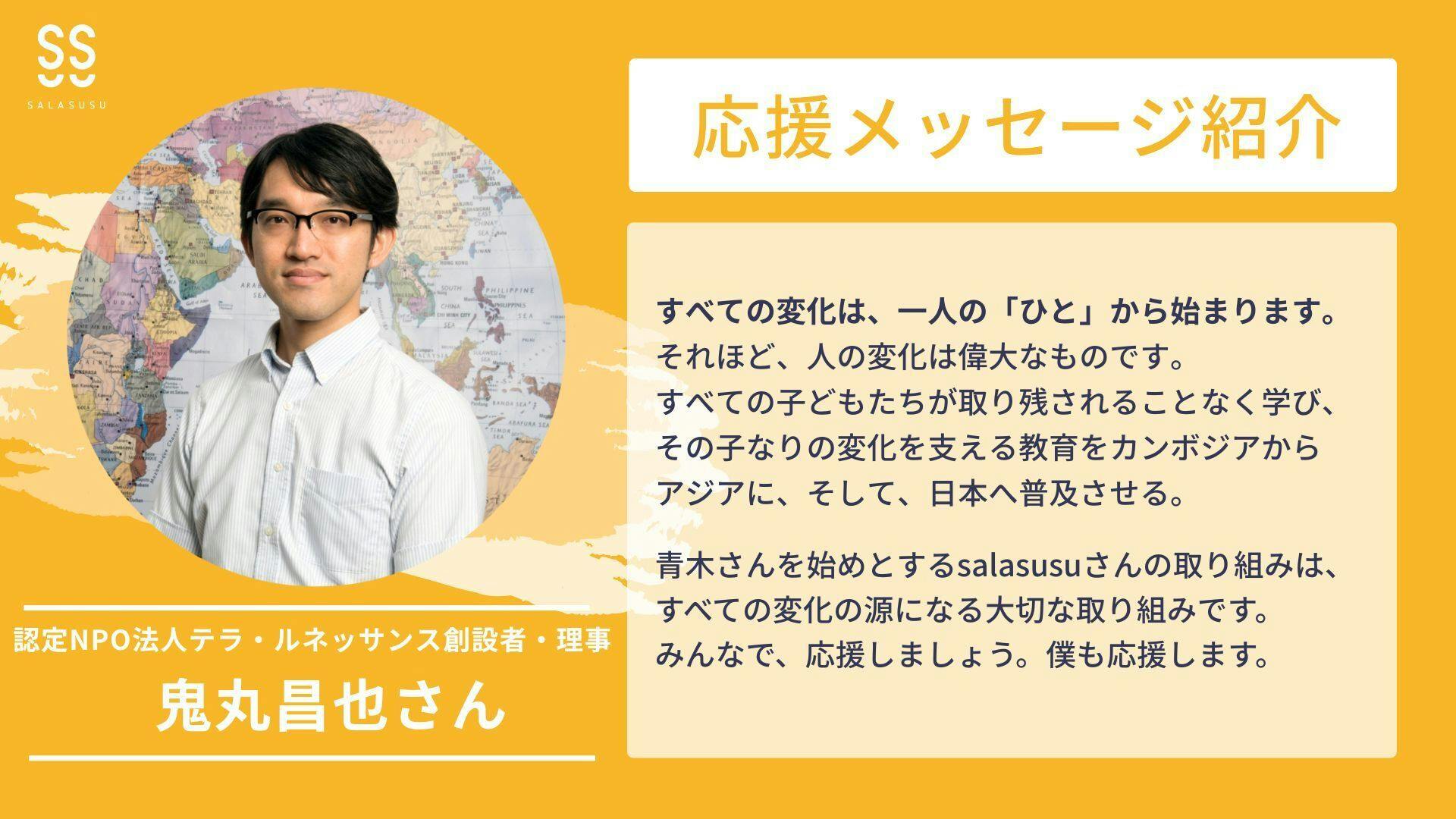 認定NPO法人テラ・ルネッサンス創設者・理事 鬼丸昌也さんから応援メッセージをいただきました。ありがとうございます!