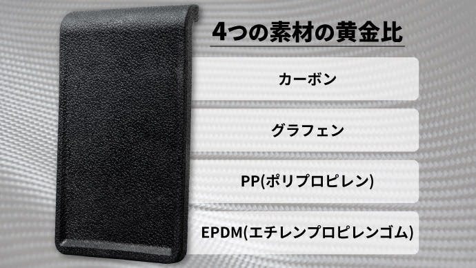 それに加え、非常に軽く、良延伸性や高耐熱性に優れたPP(ポリプロピレン)と、ゴム製品によく使用されるEPDM(エチレンプロピレンジエンゴム)を融合させ、『EPG』と呼ばれる強力な素材が誕生しました。