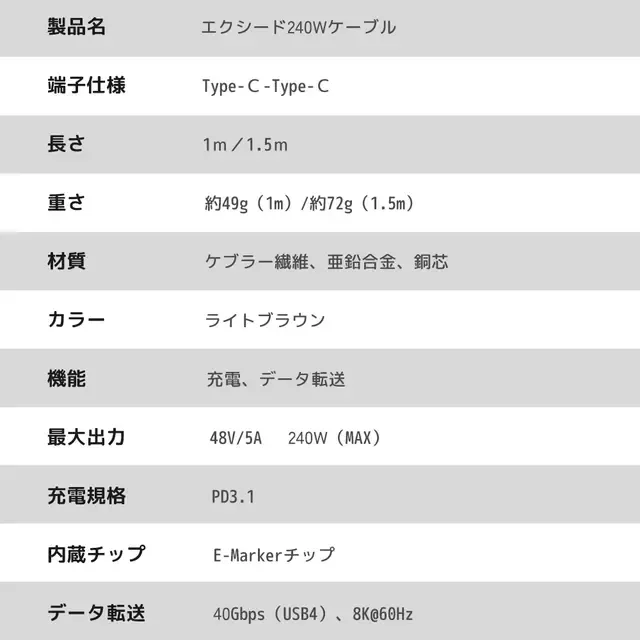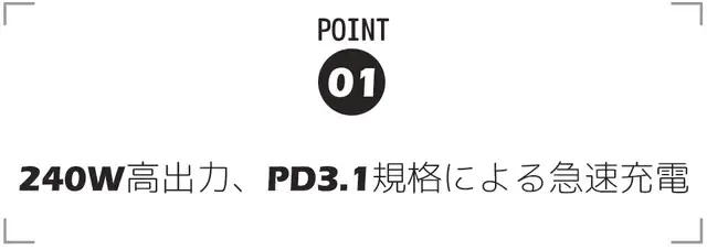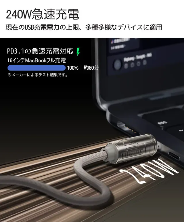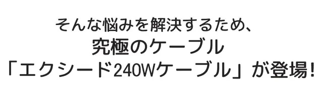 「エクシード240Wケーブル」は、240W高出力、最新のUSB Power Delivery 3.1(PD3.1)規格に対応しており、急速充電を実現します。