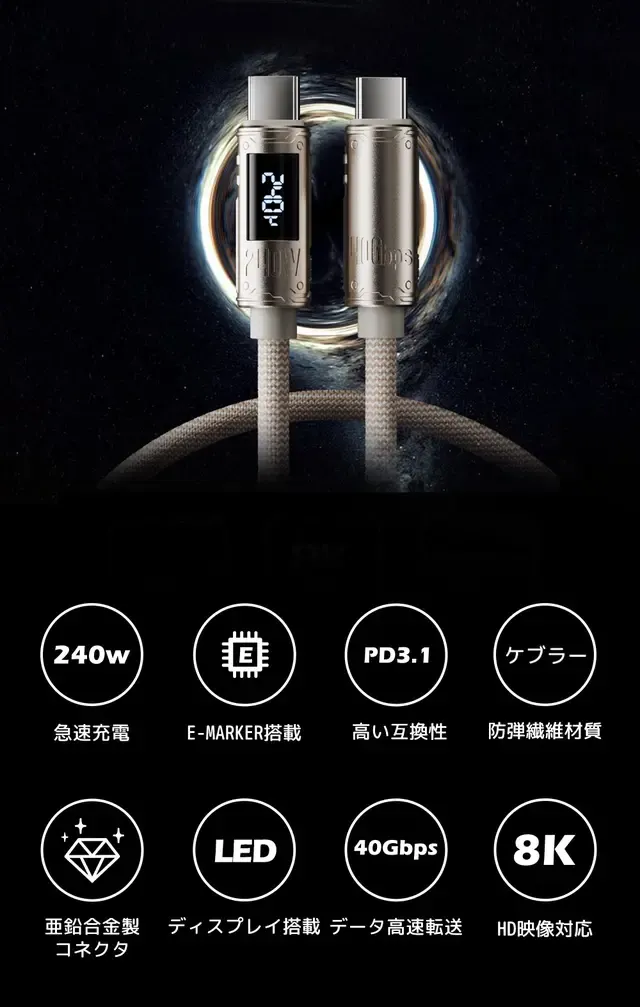 市場に多く出回っているケーブルは、10Gbpsや20Gbpsの転送速度に対応しているものが主流です。この40Gbpsの高速転送と8K映像出力に対応できる「エクシード240Wケーブル」は、データ転送のスピードや高解像度映像対応で圧倒的なパフォーマンスを発揮し、日常的に大容量データを扱う方や、映像編集、ゲームなどを楽しむ方々にとって良い選択肢です。日々の作業がスムーズになり、高品質なコンテンツを楽しむことができます。