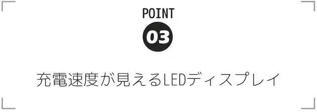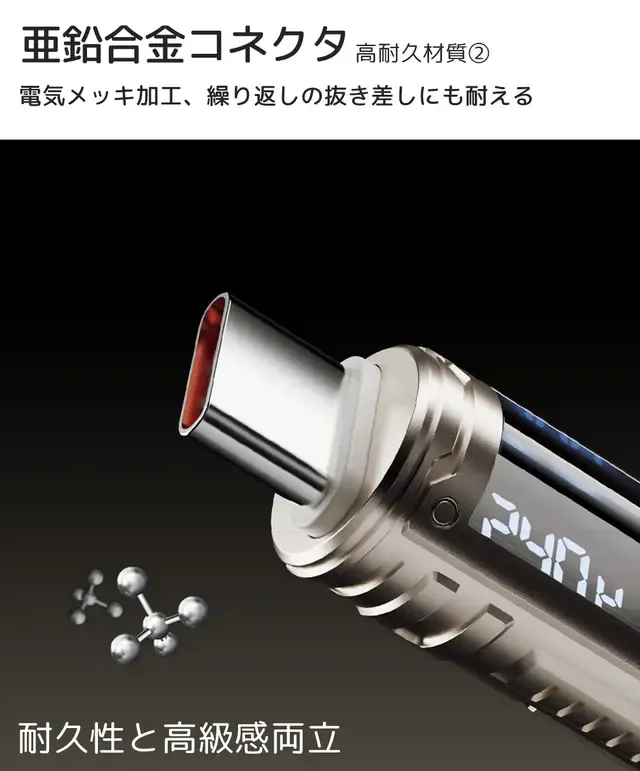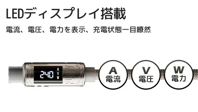 「エクシード240Wケーブル」の一端にはLEDディスプレイがあり、電流、電圧、電力を表示し、現在の充電状況を分かりやすく確認できます。充電速度を把握し、効率をアップできます。