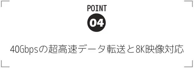 40Gbpsの圧倒的なデータ転送速度を実現し、大容量のファイルや高解像度の映像データを短時間で転送することが可能、作業効率を大幅に向上します。