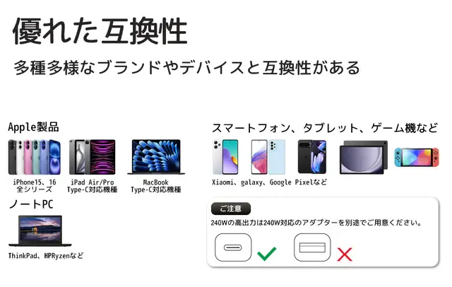 高出力のノートパソコンやゲーム機など、様々なブランドやデバイスと互換性があります。デバイスの要求に応じて電力を自動的に調整し、効率的に高速な充電を提供しながら、安全性も両立できます。