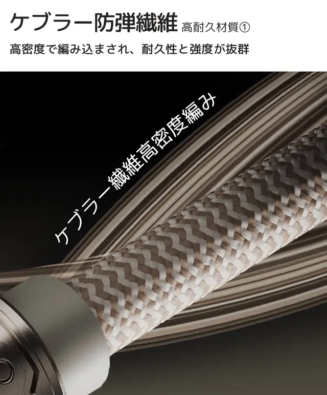 外装には、軍事用途でも使用されるケブラー防弾繊維を編み込み、驚異的な強度を実現しています。ケブラー繊維は軽量でありながら、鉄5倍の強度を持ち、ケーブルが絡まったり、表面に毛玉ができたりのトラブルがなく、長期使用しでも劣化しにくいです。