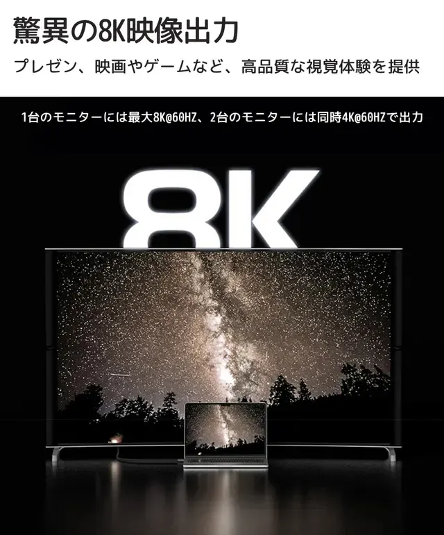 8K解像度(7680 x 4320ピクセル)までの映像データ伝送に対応しており、超高精細映像体験を提供します。写真、ビデオ、映画やゲーム、ビジュアル品質を劇的に向上させ、仕事場も娯楽でも大活躍できます。