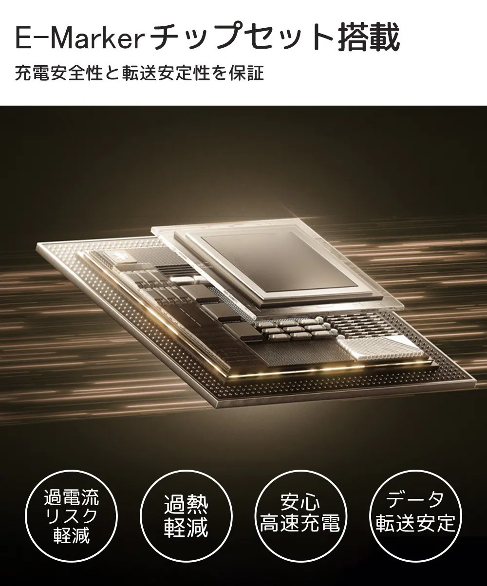 E-Markerチップは、ケーブルが対応する電力やデータ転送速度を自動的に認識し、適切な電力供給を確保し、過電流や過熱のリスクを軽減するため、安心して高速充電やデータ転送を行うことができます。