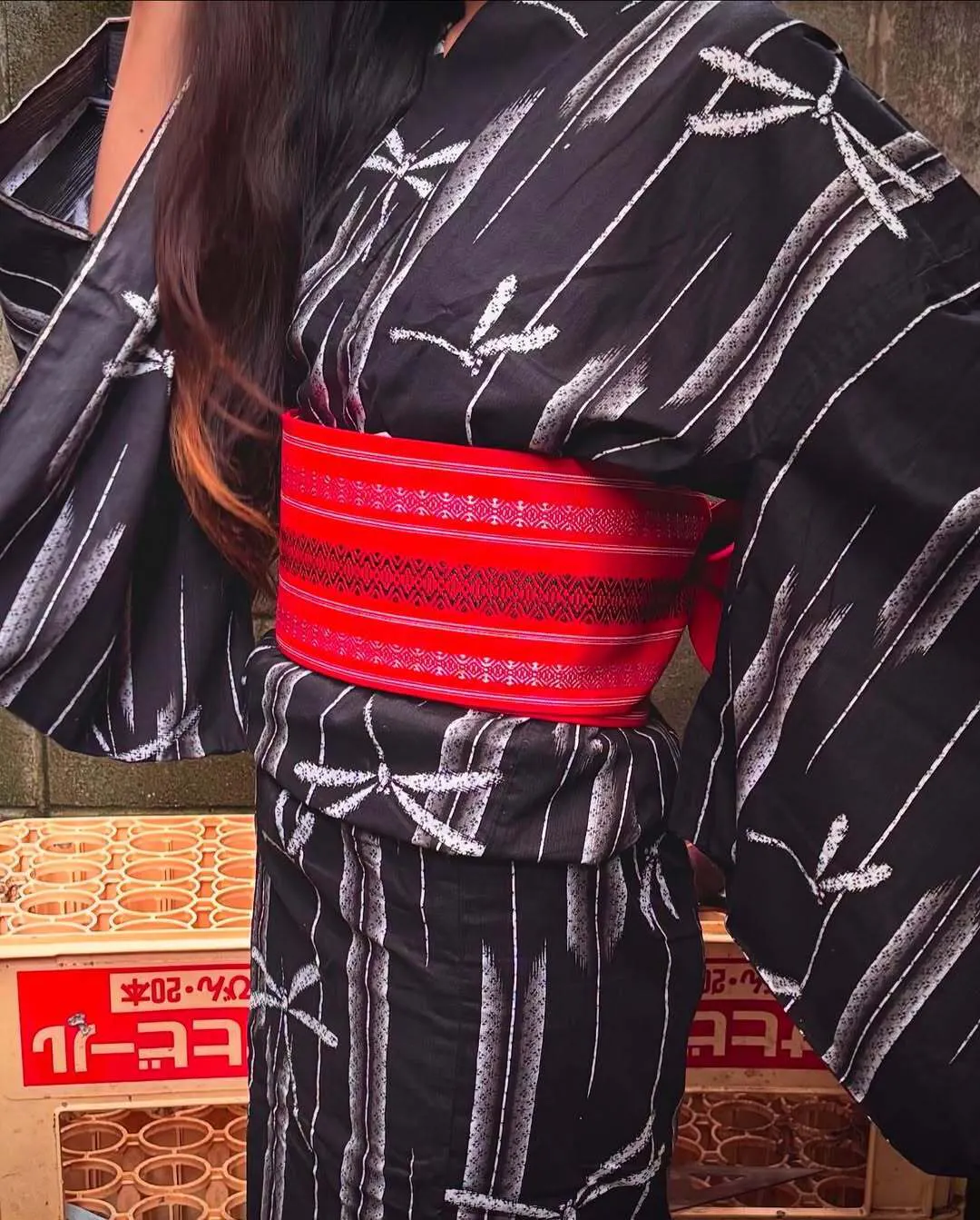 【縞影】縞を駆ける、勝ち虫の影。黒地に白の縦縞とトンボの入った浴衣。トンボは古来より「勝ち虫」と呼ばれ、縁起の良いモチーフとしても人気。加えて縦縞が入ることでスタイルもすっきり見え、凛とした佇まいと機能美を兼ね備えた印象を与える