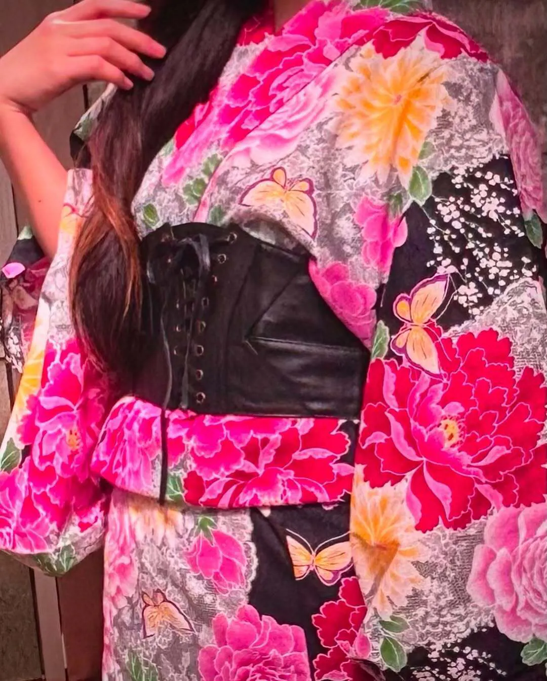 【宵咲蝶】華やかで、大人びた雰囲気の浴衣。黒地に咲き誇る花々、そこに彩りを添える蝶々と繊細なレース模様が特徴の一枚です