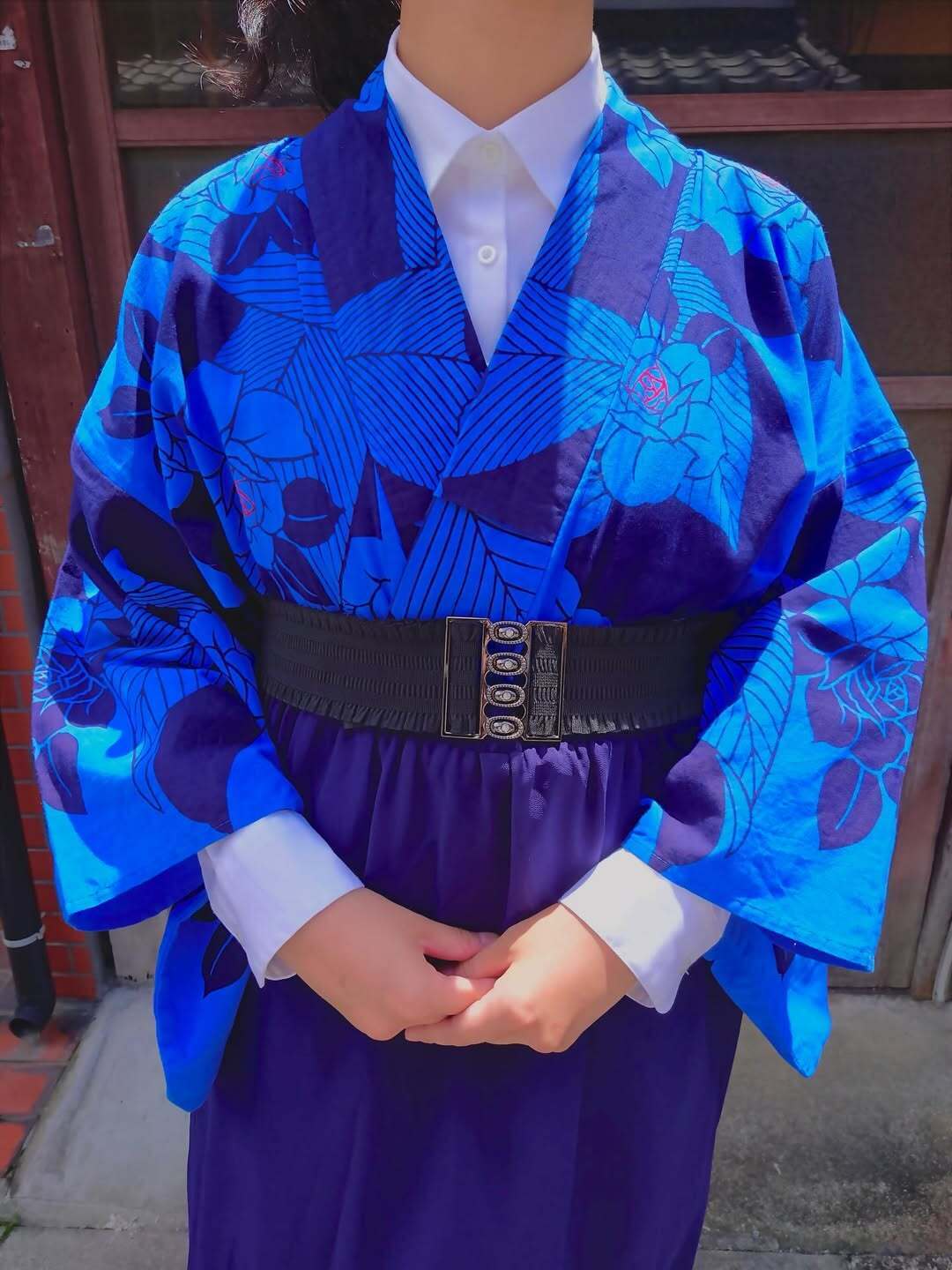 【藍薫】風をはらんで、青に沈む薔薇。カラートンが絞られており、シックで落ち着いた印象の浴衣。鮮やかな青地に紺で大ぶりの薔薇の花と葉があしらわれた非常に力強く華やかな一枚