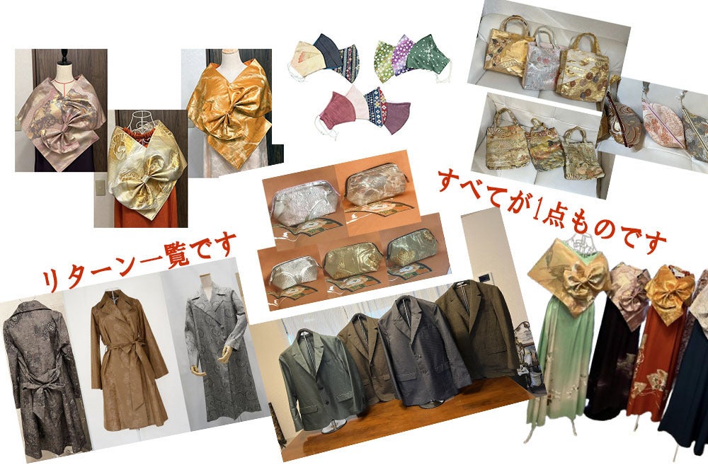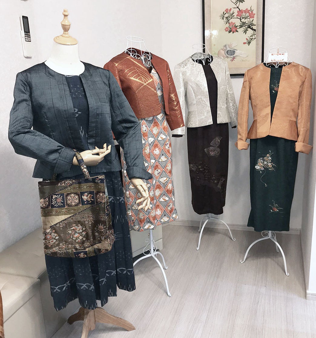 古い和服や帯にもう一度命を吹き込んで、まったく新しい洋服や小物へ。1点ずつ、柄の配置から全体のコーディネートまでこだわり抜いた唯一無二の作品を生み出しています。世界に一つしかないその一点が、着る人の人生をキラキラと照らす存在になるよう、日々制作に励んでいます。