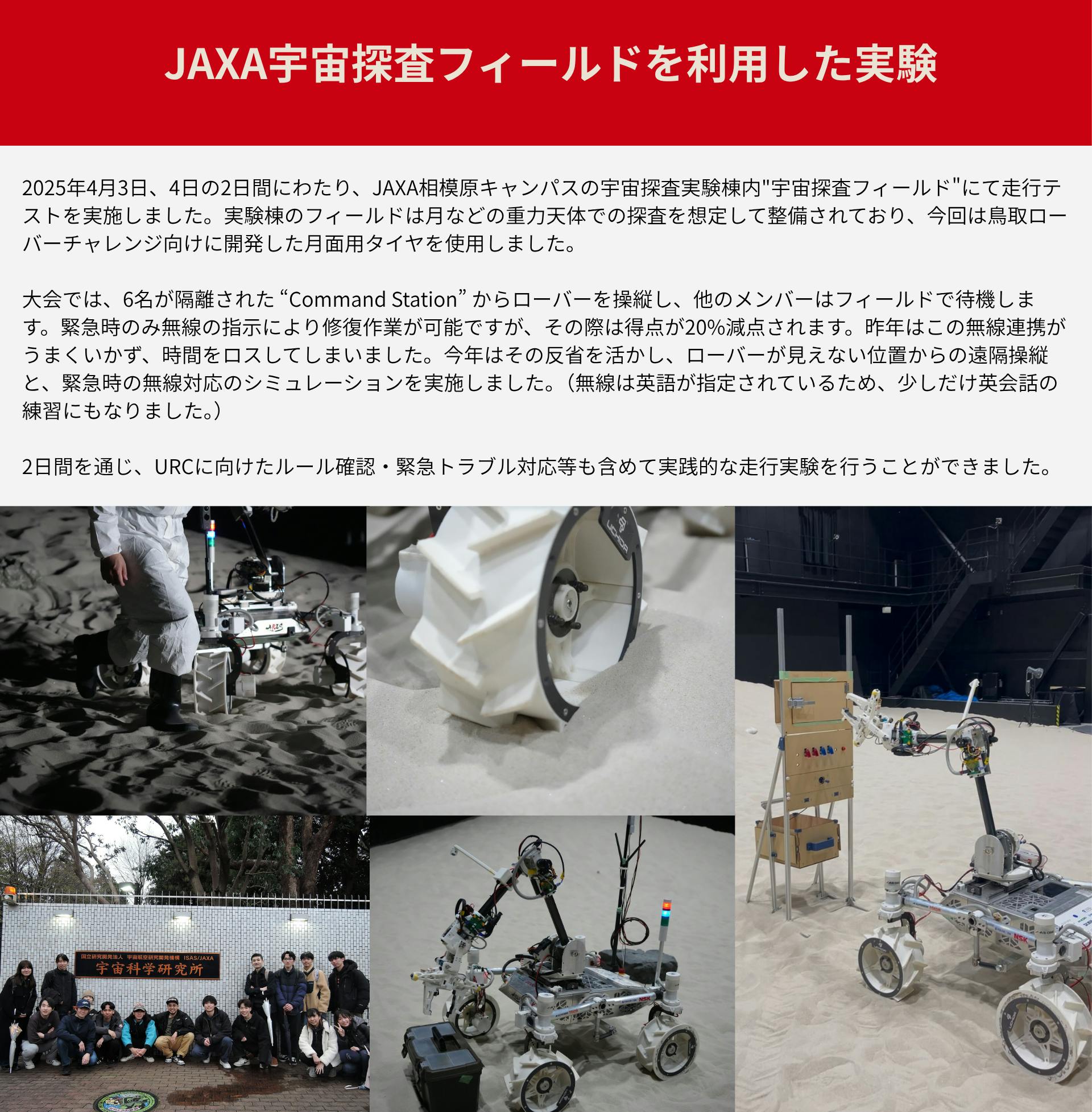 2025/12/28 07:58こんにちは、ARES Project のRichardです!12月下旬に実施した東北合宿2日目は、片平の拠点での作業を中心に活動を行いました。今回の合宿は、新機体であるARES9の機構が完成して2回目の合宿および実験でしたが、1日目の走行実験が順調に進んだこともあり、全体として終始穏やかな雰囲気の中で開発や実験が進められていきました。実験では、ローバーに搭載したカメラ越しでの模擬宇宙船のメンテナンスミッションを行い、ローバー本体の挙動やロボットアームの動作確認を行いました。また、合宿1日目の実験中に破損したロボットアームの把持部分について強度の再確認を行い、モニター越しでの操作性や作業精度についても検証を進めました。さらに、それぞれの部門ごとにも開発が着実に進められ、URC2026に向けて機体が徐々に完成へと近づいていることを実感しました。全体として昨年よりも順調にすすんでいる一方で、今回の合宿を通じて多くの改善点が明確になったため、今後の開発に活かしてより完成度の高い機体にしていければと考えています。合宿Day1レポートはこちらよりご覧になれます。 もっと見る