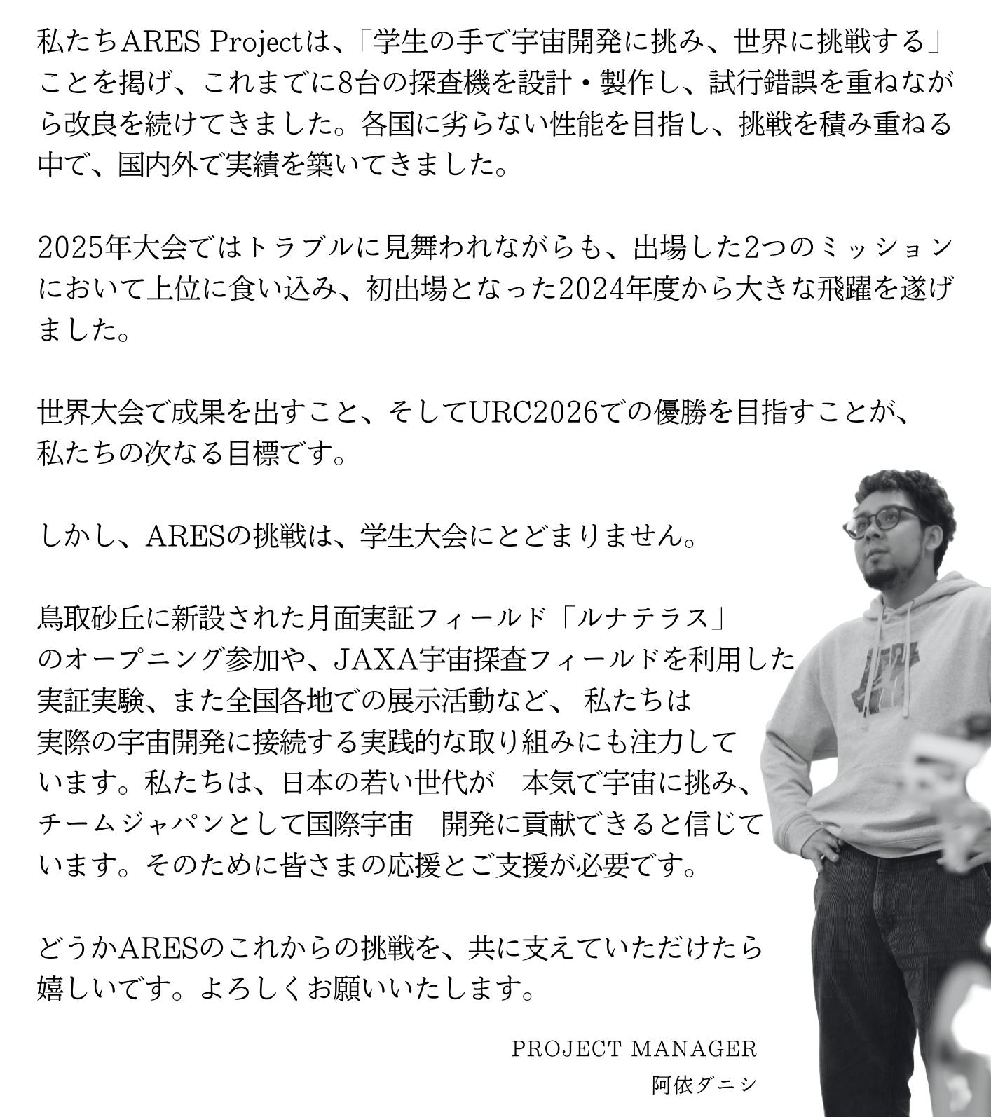 そんな中、私たちは2022年3月に日本初となる学生による火星探査機開発チーム「ARES Project」を立ち上げ、2024年のURC大会に日本初のチームの一つとして参加しました。