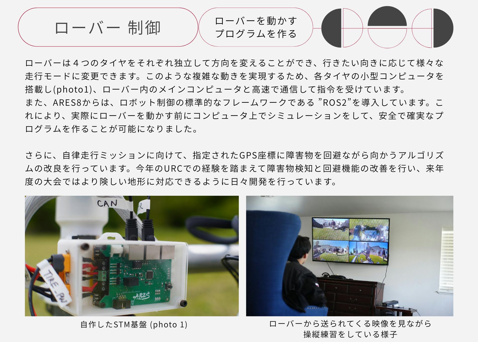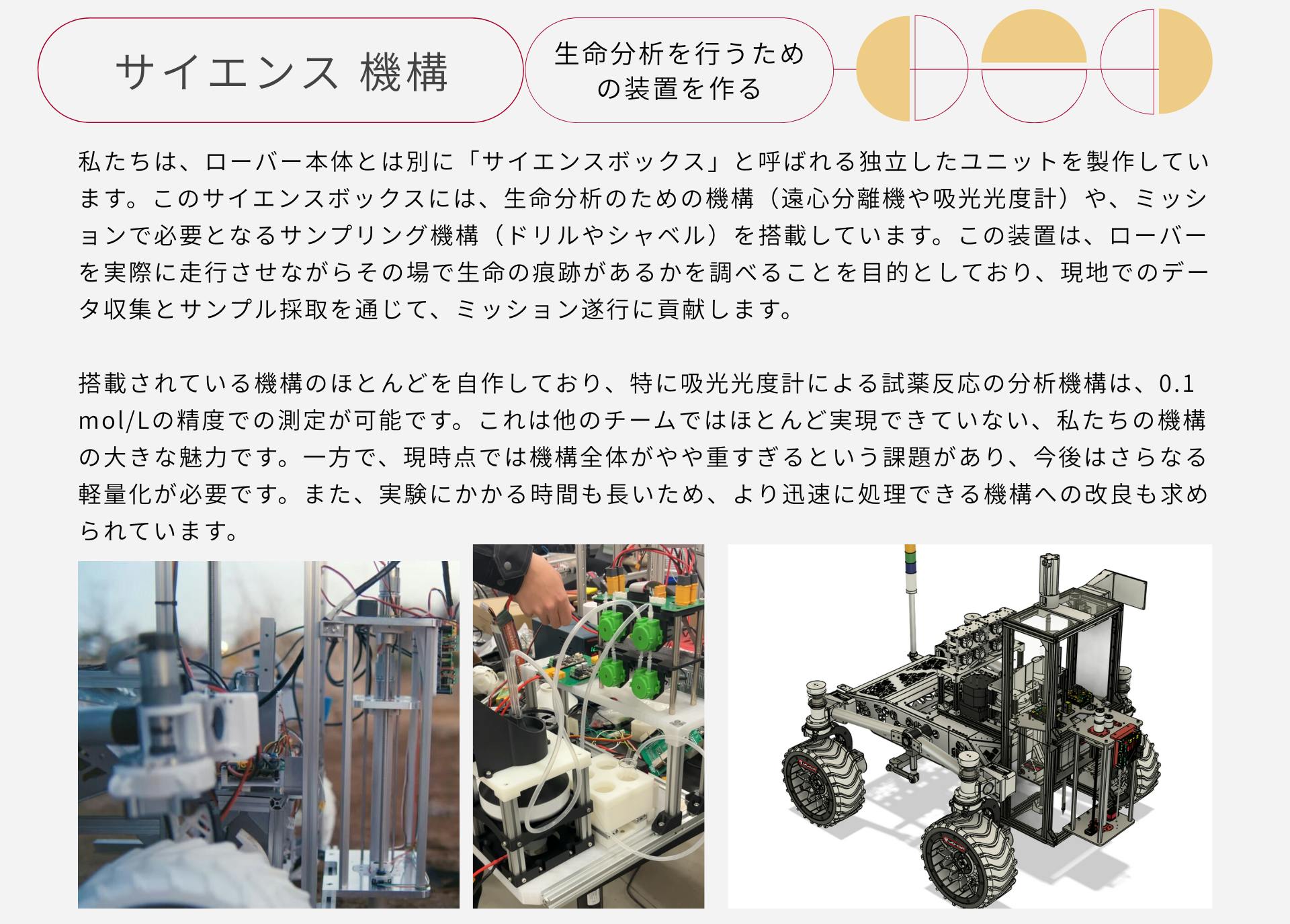 2025/12/27 19:55第15弾は、生命分析装置の制御、電装を担当するKotochan。ローバーに収まらずロケット製作サークルまで所属している、生粋のものづくり人です。いつも冷静沈着で、筋道の通った論理を展開する様子はとても学部2年生には見えません。博士課程のメンバーにも「それ違くないですか?」と何食わぬ顔で反論していて感心しました。今年開発を担当した生命探査モジュールはアクシデントにより本番で動かすことはできず。雪辱を誓う来年の活躍に期待です!KOTOCHAN : サイエンス制御✴︎ ARES で担当していることARESでは、Science Missionで使用する生命分析機構やドリル・各種センサの制御を担当しています。Science制御では扱うモータやセンサの種類が多く、最初のうちは「どのモータが何を動かすのか」が分からず苦戦しました。さらに、単にモジュールを動かすだけでなく、理論班が分析に使うためのデータを正確に取得する必要があり、その難しさを痛感することも多いです。一方で、期待通りのデータを取得できた瞬間の達成感は格別です。Science制御の魅力は、何といっても理学系(理論系)のメンバーと一緒に開発できることだと思います。試薬や分析手法・装置について一緒に調べたり、遠隔制御用アプリに対してフィードバックをもらったりと、分野を超えた活動の中で多くの刺激を受けています。ローバーの上の「小さな実験室」にワクワクしながら、日々開発に取り組んでいます!✳︎ 大切にしていること私の開発におけるこだわりは「チームで開発すること」です。私は中学生の頃から部活動で物作りを経験し、「自分1人ではできないことも、チームで協力すれば実現できる」ということを実感してきました。もちろん物作りそのものも好きですが、黙々と一人で作業するよりも、仲間とアイデアを出し合いながら形にしていく時間が好きです。Science班には、理論班が考えた分析手法を機構系のメンバーが形にし、それを私たち制御班が動かすという「分野を超えた人との繋がり」があります。それぞれの専門性がつながって一つのミッションに挑む環境は、チームで開発をしたい私にとって最高の環境です。✳︎ PASSION私のPassionは「宇宙×物作りの魅力を多くの人に伝えること」です。私は、中学・高校の部活動でモデルロケットの製作に取り組み、大会を通じて同年代の航空宇宙工学を志す仲間や、実際に企業で開発に携わる方々と出会いました。その経験を通して、宇宙や物作りの奥深さ・楽しさを知り、機械系に進みたいと思うようになりました。 STEM教育の一環として活動や大会を支えて下さった方々の存在がなければ、私は宇宙にも物作りにも興味を持たなかったと思います。だからこそ、私が「魅力を伝えたい」と思うのは、当時支えてもらったことへの“恩返し”の意味も込められています。現在はARESでの活動に加えて、学内の物作り系団体にも所属し、小中高生を対象に工作教室や宇宙に関するワークショップを企画・運営しています。ARESでも機会があれば同様の活動をしてみたいです。✴︎ 今後ARESで挑戦したいこと今後も、Science制御の分野でARESに貢献していきたいと考えています。Science制御は、理論班が考える分析手法や、機構班が設計した装置を理解したうえで、それを「どのように動かすか」を考える立場にあります。今はまだ、理論班や機構班の要望に応えるものを作り上げるので精一杯ですが、将来的には機構・理論の知識を身につけ、互いの立場を理解したうえで開発を進められるようになりたいです。最終的には、分析プロセスの全自動化にも挑戦し、Science Missionの効率化と精度向上に貢献できればと考えています。 もっと見る