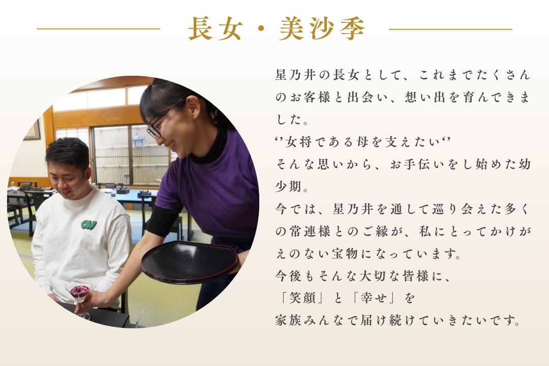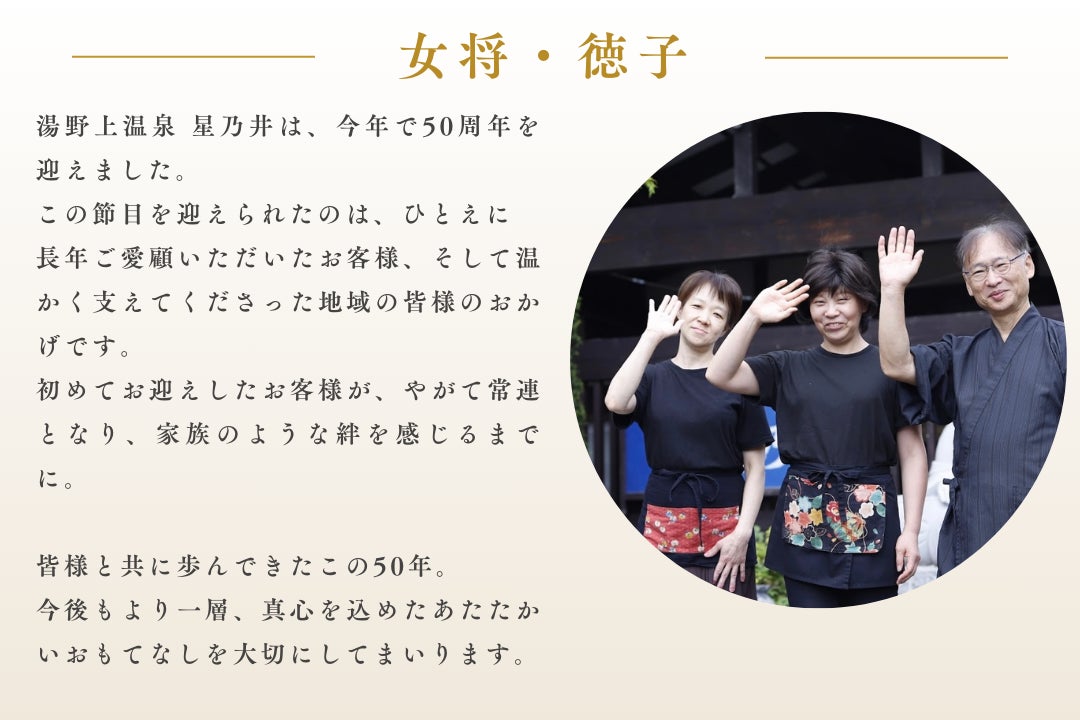 湯野上温泉は、山々に囲まれた自然豊かな地にあり、湯量にも恵まれながら、まだ広く知られているとは言えない温泉地です。そのような中でも、ここまで宿を続けてこられたのは、お越しくださるお客さまの八割以上を占める、常連の皆さまのお力添えがあってこそです。これまで星乃井を支えてくださいましたすべての皆さまに、改めて、心より御礼申し上げます。