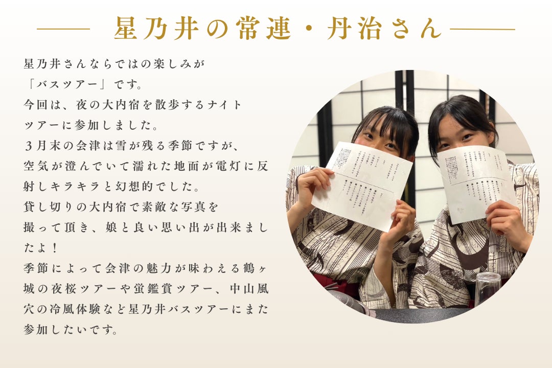 会津の魅力、そして星乃井のまごころを感じていただきたくご用意させていただきました。星乃井限定夜のツアーをご堪能ください。