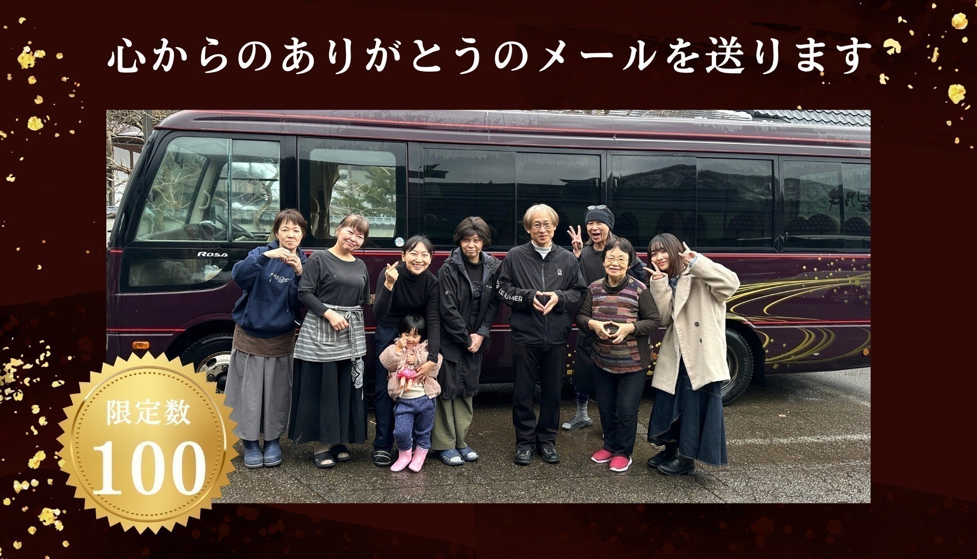 そんな想いから、まごころの宿星乃井のナイトツアーは始まりました。以来二十余年にわたり、一台のバスとともにたくさんの笑顔を乗せて走り続けてきましたが、そのバスは長年の使用により経年劣化が進み、走行不可能な状態となりました。このクラウドファンディングは、星乃井が長年大切に育んできた“まごころ”をこれからも変わらずお届けするために立ち上げた、ツアーバスの買い替えを目指すプロジェクトです。