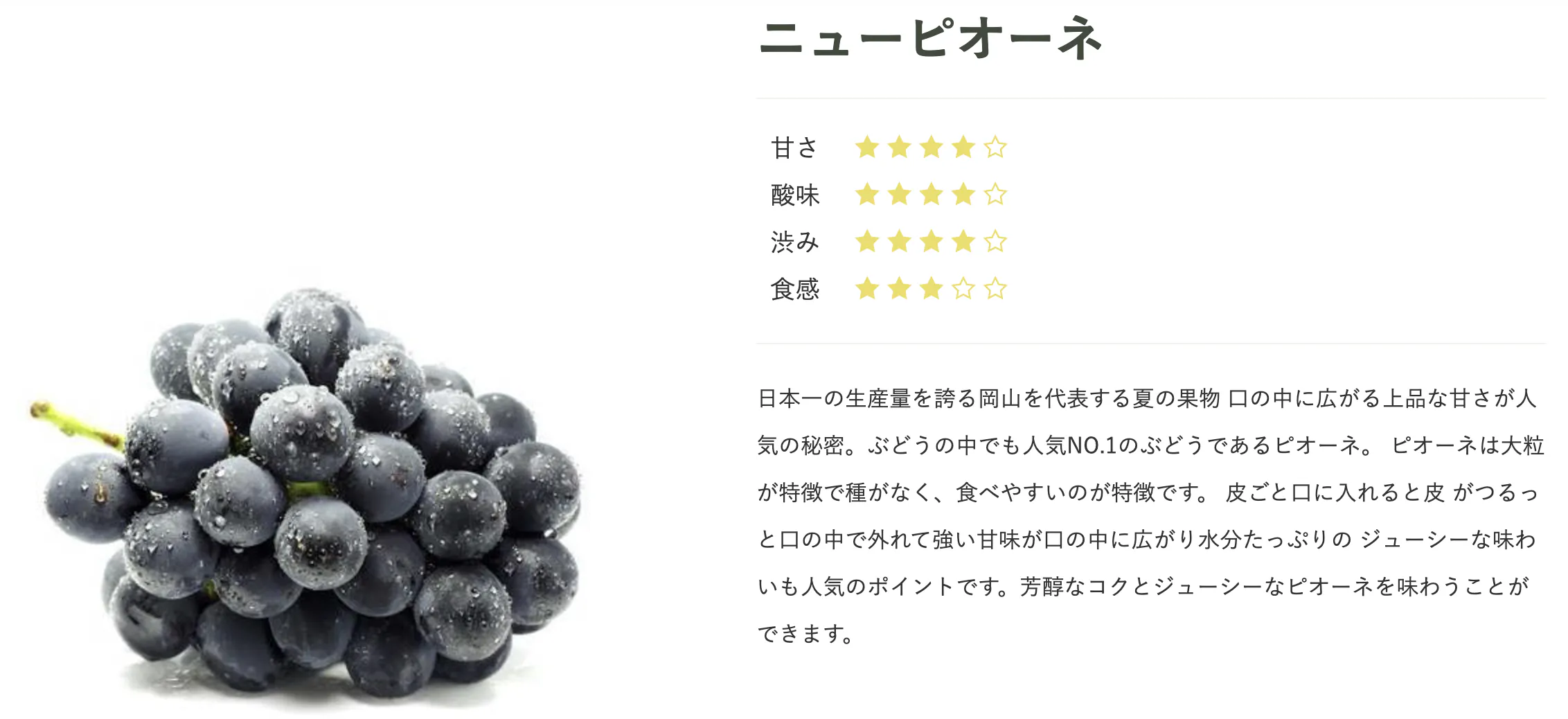 私たちの農園では、大粒で種がなく食べやすい品種である『シャインマスカット』や『ニューピオーネ』など、上品な甘さと香りが自慢のぶどうを栽培しています。