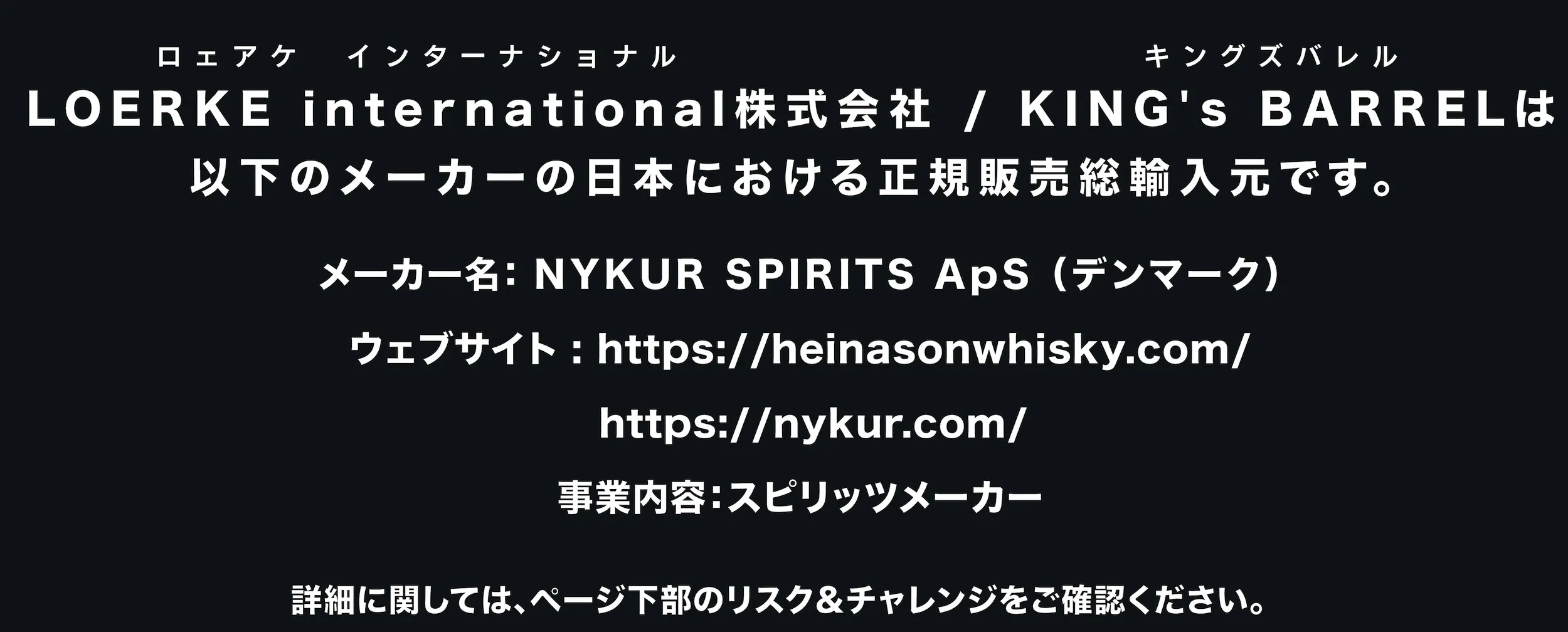 ドイツと北欧のウイスキーとスピリッツの美味しさと各蒸溜所が持つ素晴らしい物語に惚れ込んで、日本ではまだ知られていないハイクオリティで美味しいお酒を取扱うLOERKE international株式会社は、KING's BARREL(キングズバレル)という名前で、未知の美味しいお酒が待つ世界への扉として、日本に住むすべての皆さんと一緒に、その扉を開いて美味しいお酒を探求する旅に出かけようというコンセプトのもと、独自に選び抜いた自らが美味しいと思ったお酒のみを各蒸溜所/メーカーより直輸入し、日本総輸入元として蒸溜所と二人三脚で国内での卸と小売を行ってきました。