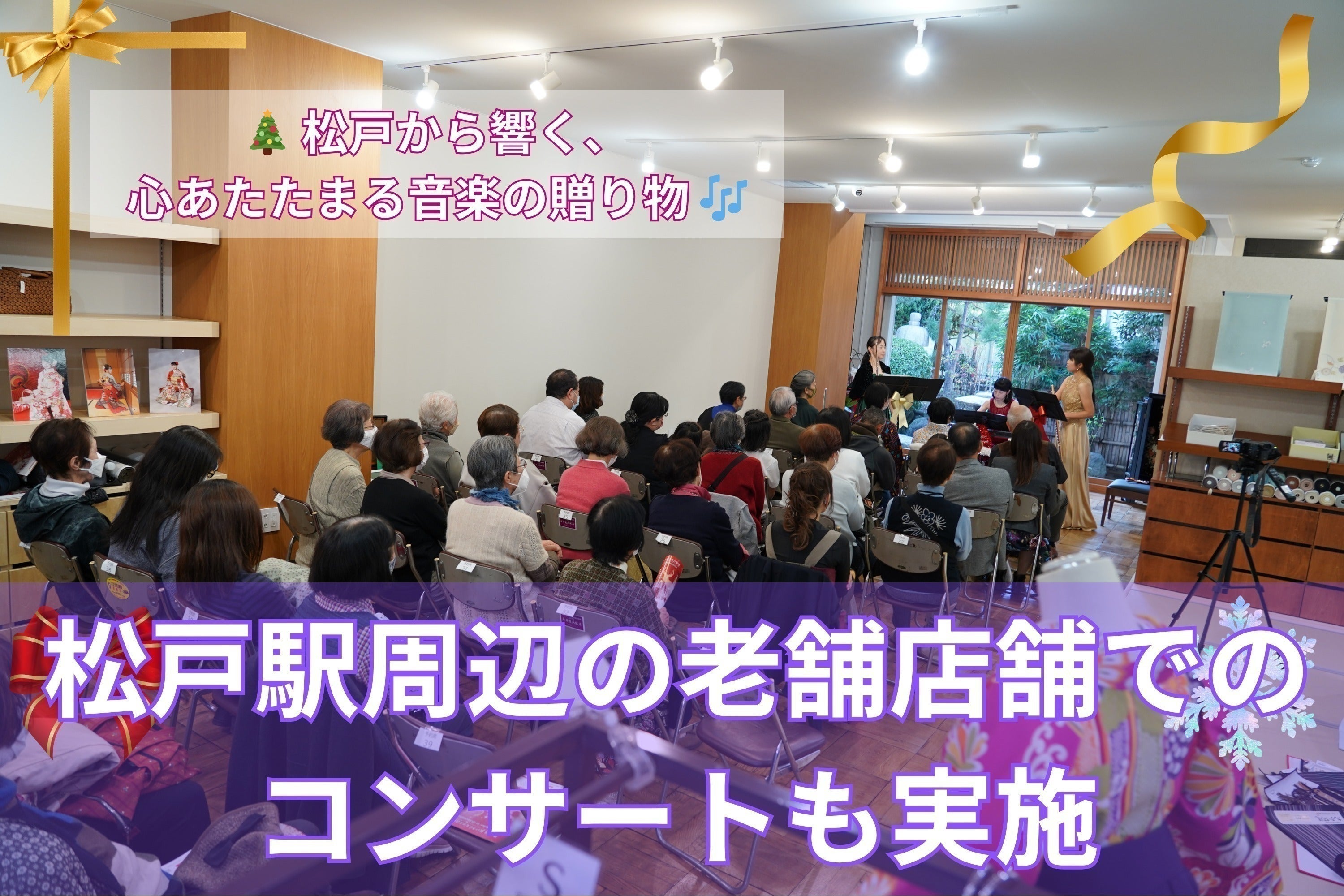 上質な生の演奏をもっと身近に感じてほしいという想いから、プロのアーティストもを多数招き、松戸駅周辺の飲食店をはじめ、小ホールや大型店、神社仏閣など、11月中旬から12月25日まで様々な場所で小さな演奏会を企画しています。