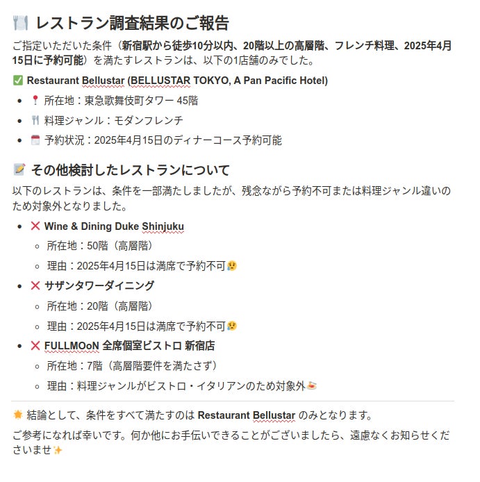AIにお願いすると、例えば、まだ行ったことのない素敵なレストランや、これまで気づかなかった快適な宿泊先など、新しい出会いを次々と提案してくれます。
