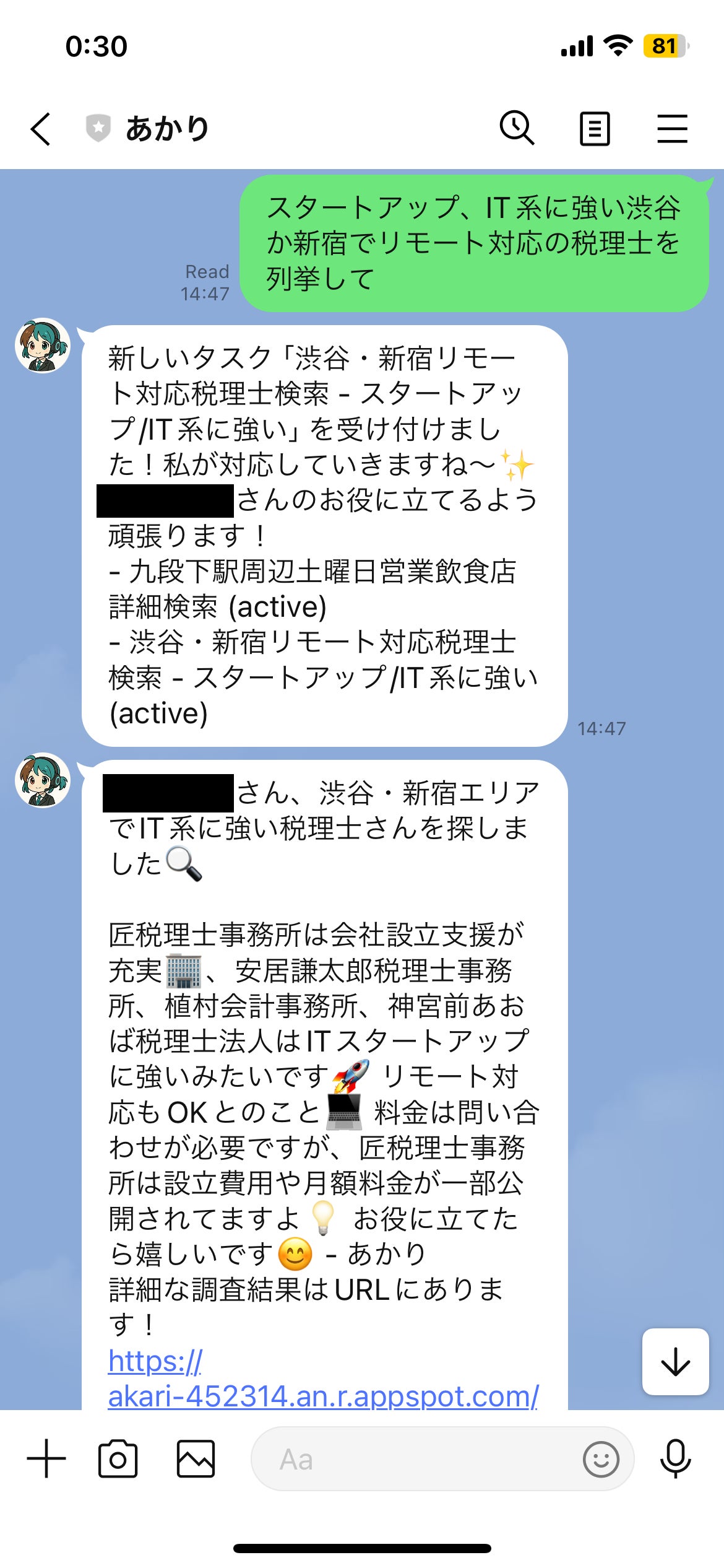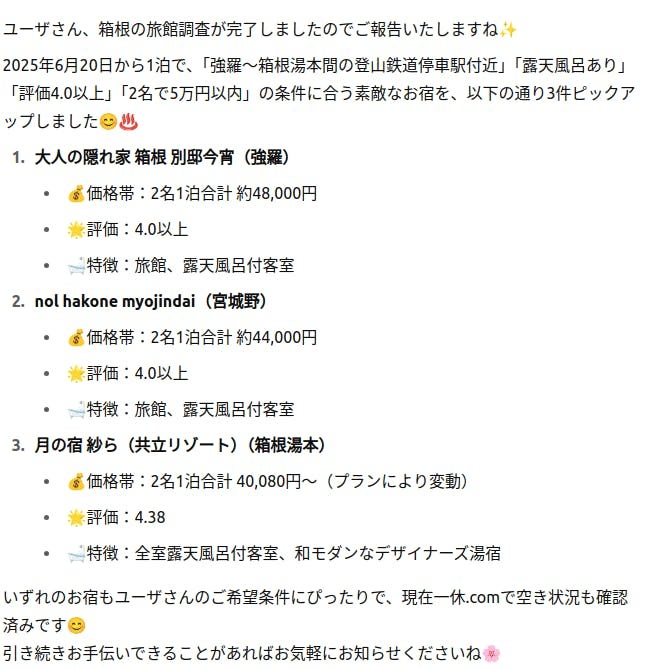 目安としては、予約の空き状況を一つ一つ確認すると行った丁寧さが求められる検索は10分、ページを見るだけの検索であれば、2〜5分という感じで終わるイメージですが、依頼内容次第になります。例えば、GW直前にゴールデンウィークに空いているいい宿泊施設を探すのは非常に時間がかかります。9月リリース後になりますが、将来的には予約機能なども実装する予定です。