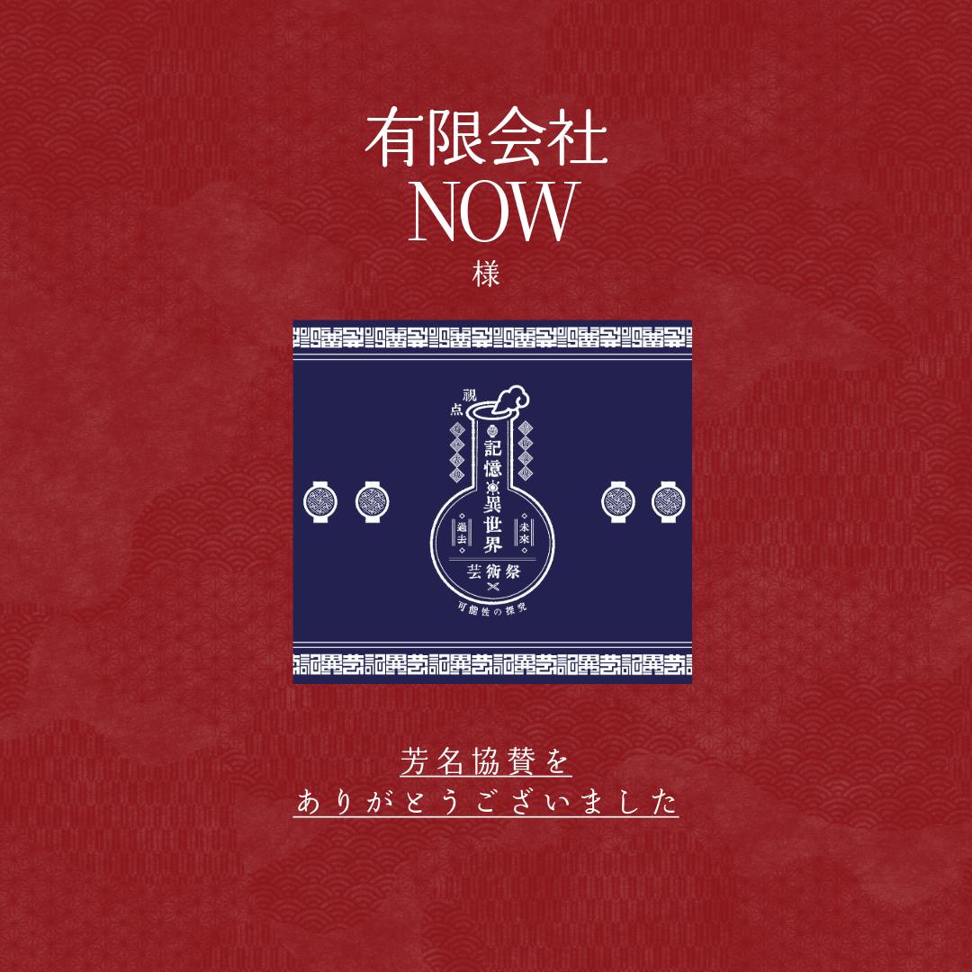 有限会社NOW(プリントショップNOW)様から、芳名協賛をいただきました!キーホルダーからチームグッズまで、地域のクラブや学校まで、長年取り扱ってきた京都の印刷会社です。芸術祭のオリジナルTシャツもこちらの企業からご支援という形で特別なお値段で制作していただいてます。様々な形でご支援をお申し出いただき、ありがとうございました!