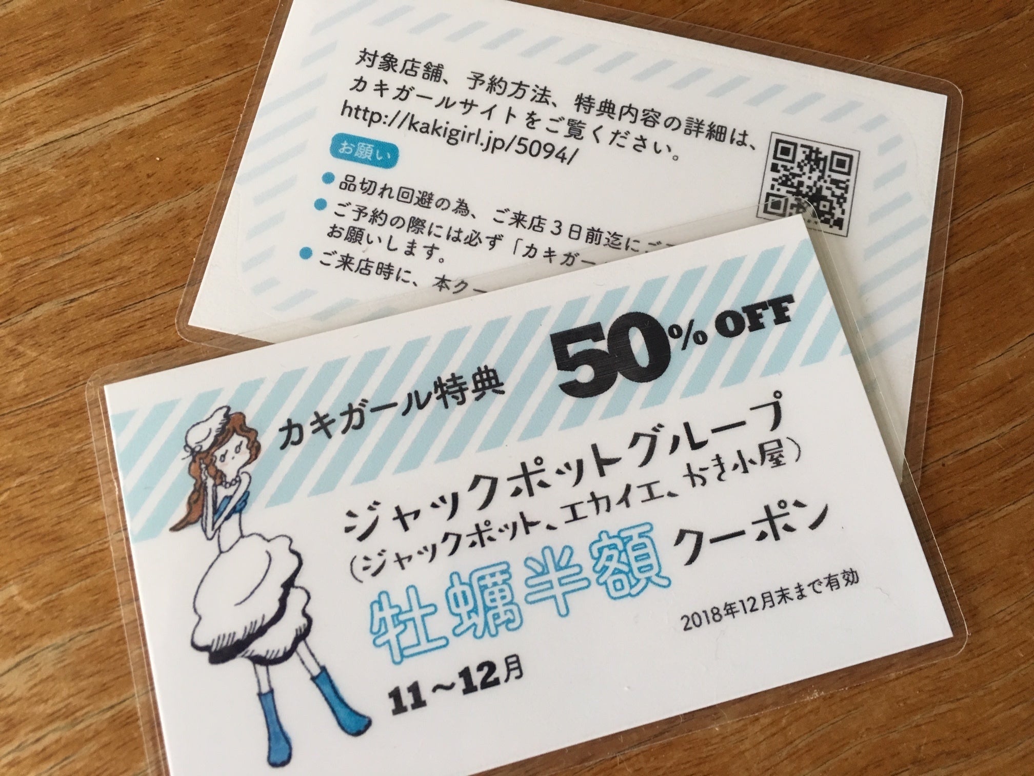 2018/10/26 09:51カキガール特典のクーポン券ができました! こちら、【回数無制限!年内生牡蠣半額コース】を支援していただいた方にお送りするクーポン券です。 カキガール編集長もおススメ! ジャックポットさんが運営する下記の16店舗で、11-12月の牡蠣シーズンに回数無制限、同伴者もOKの生牡蠣半額クーポンです。 対象店舗(かき小屋では、焼き牡蠣も50%OFF ) ジャックポット下北沢店 ジャックポット新宿店 エカイエ ジャックポット品川店 ジャックポット丸の内店 ジャックポット国際ビル店 ジャックポット汐留店 ジャックポットみなとみらい店 かき小屋 祐天寺店 かき小屋 恵比寿店 かき小屋 新橋店 かき小屋 新橋2号店 かき小屋 高円寺店 かき小屋 みなとみらい店 かき小屋 町田店 かき小屋 桜坂店 3,500円で生牡蠣半額に!(年内回数無制限、同伴者もOK!) ひとり2,000円分食べたら、4人でいけば1回で元取れちゃうというお値打ち価格。もちろん男性でも購入できます。 カキガールの存続のためにも、一口でも応援していただけた嬉しいです。そして牡蠣好きな皆さんに宣伝していただけたらありがたいです。 よろしくお願いします! もっと見る