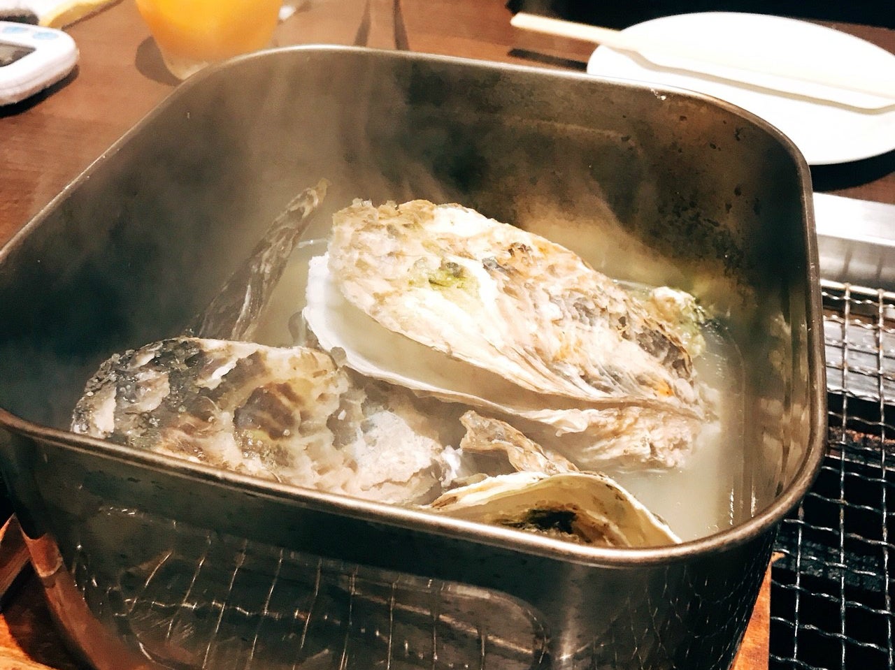 何とカン缶に蒸し牡蠣がどっさり! 「かき小屋」ならではなお通し。ホッカホカの湯気から立ち上る磯の香りに一気にテンションMAX★熱々のところをいただきます。