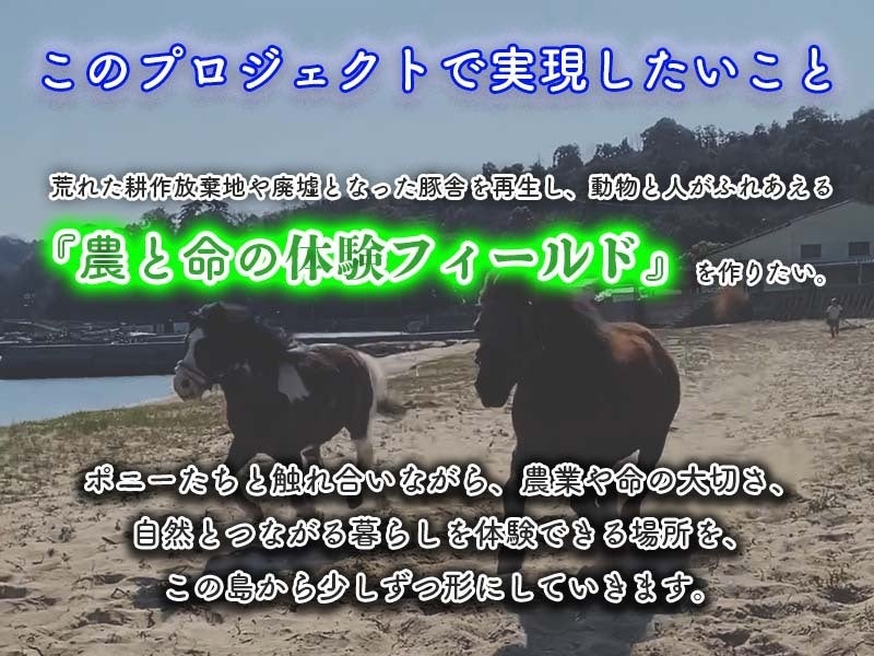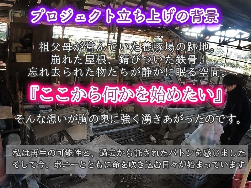 再生した厩舎を拠点に、ポニーたちとのふれあいや農業体験を通じて、**「農」「命」「自然」**を体感できる場所を作りたいと考えています。
