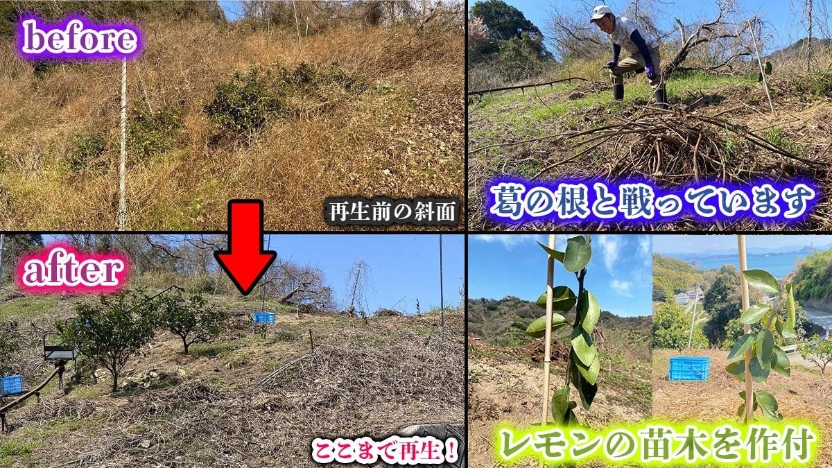 ・2023年〜2025年 合計農地6個、約3反分の面積を再生準備完了(耕作放棄地と半ば眠っていた農地)。現在は約1反の耕作放棄地に手をかけ、レモンを順に定植