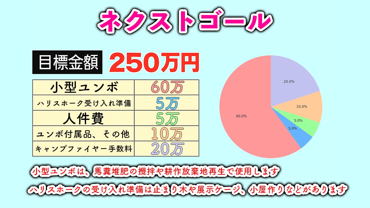 オーナー様にご負担いただく個体費を除き、受け入れに必要な設備・資材や餌代などは、ネクストゴールの支援金にて整備を進めていきます。ハリスホークが活躍できる環境づくりを、どうか一緒に応援してください。