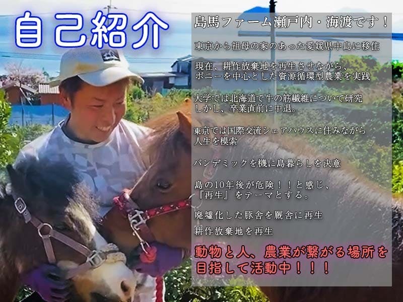 はじめまして!愛媛県・中島で農業と動物たちと共に暮らす「島馬ファーム瀬戸内」の海渡(かいと)です。
