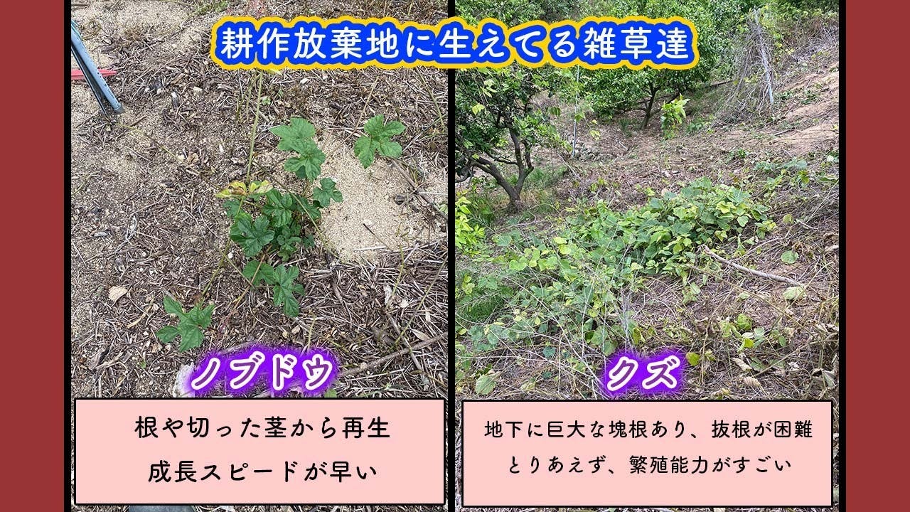 2025/05/25 08:30◯お礼みなさん、本当にありがとうございます!!支援金額が50万円を突破しました!!本当に感謝しています。本当に。そして、ここからがまた難しい戦いに入ります。当面の目標を100万円にします。命と農が学べる場所作りにどうかご支援よろしくお願いします。◯本日の報告【耕作放棄地の整備をしてきました!!】耕作放棄地再生と言っても、その場所に生えてる雑草や雑木で再生難易度が全く違います。ここの畑は約10アール(1000平方メートル)ありますが。再生する前は、クズに侵食されてた畑になります。このクズが厄介なのです。約30センチ置きに根を張り、その根は真下にごぼうみたいに成長します。これが、繁殖能力の高さが保てる秘密になります。エネルギー貯蔵庫です。草刈りをして、何回も除草剤しても生えてくるのです。その他にも野葡萄やノバラといった厄介な雑草があります!!!雑草魂対決です!!!一気には進めませんがこの農地にまた定植できました!!!伐採した、アカメガシワの木があるところに植ってるのがまた耕作放棄地再生っぽいですよね!!!まだまだ頑張ります!!!!◯メッセージこうして自然と土と向き合うことは、しんどいですがメンタルヘルス的にはすごくいいことなんです!!人が不安になる時、脳内ではセロトニンという物質が不足傾向になるそうです。というか、不足することでイライラを感じる物質の調節が効かなくなるといった方がいいかもですね。なんと、その超重要なセロトニンが土を触ることで増えるらしいです。 農を学ぶは脳を学ぶに繋がるんですね!!! もっと見る