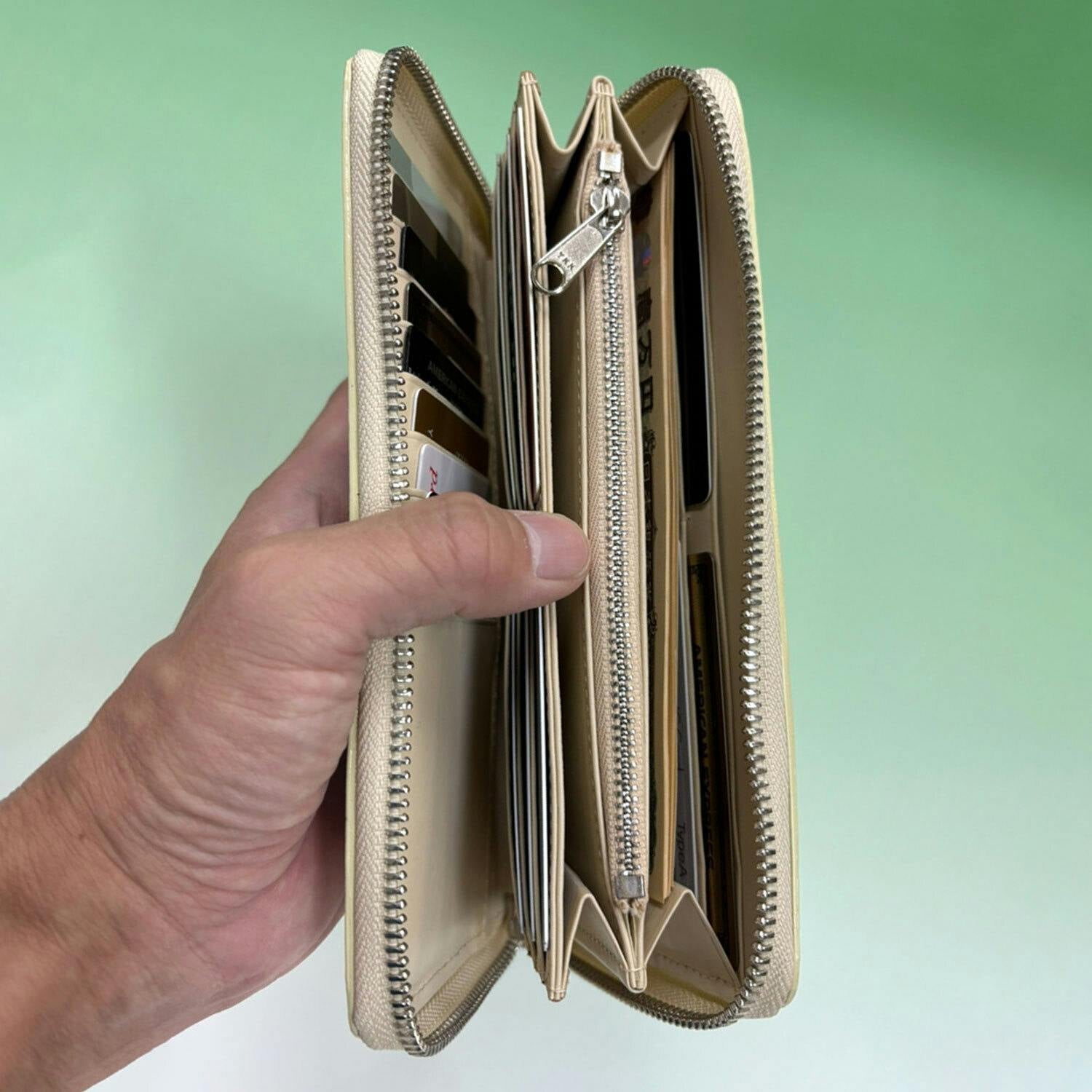 ラウンドジップを開けるとガバッと開く仕様。小銭やお札が取り出しやすいのはもちろん、カード類もさっと取り出せます。収納力にもこだわって製作。最大21枚カードを収納できます。