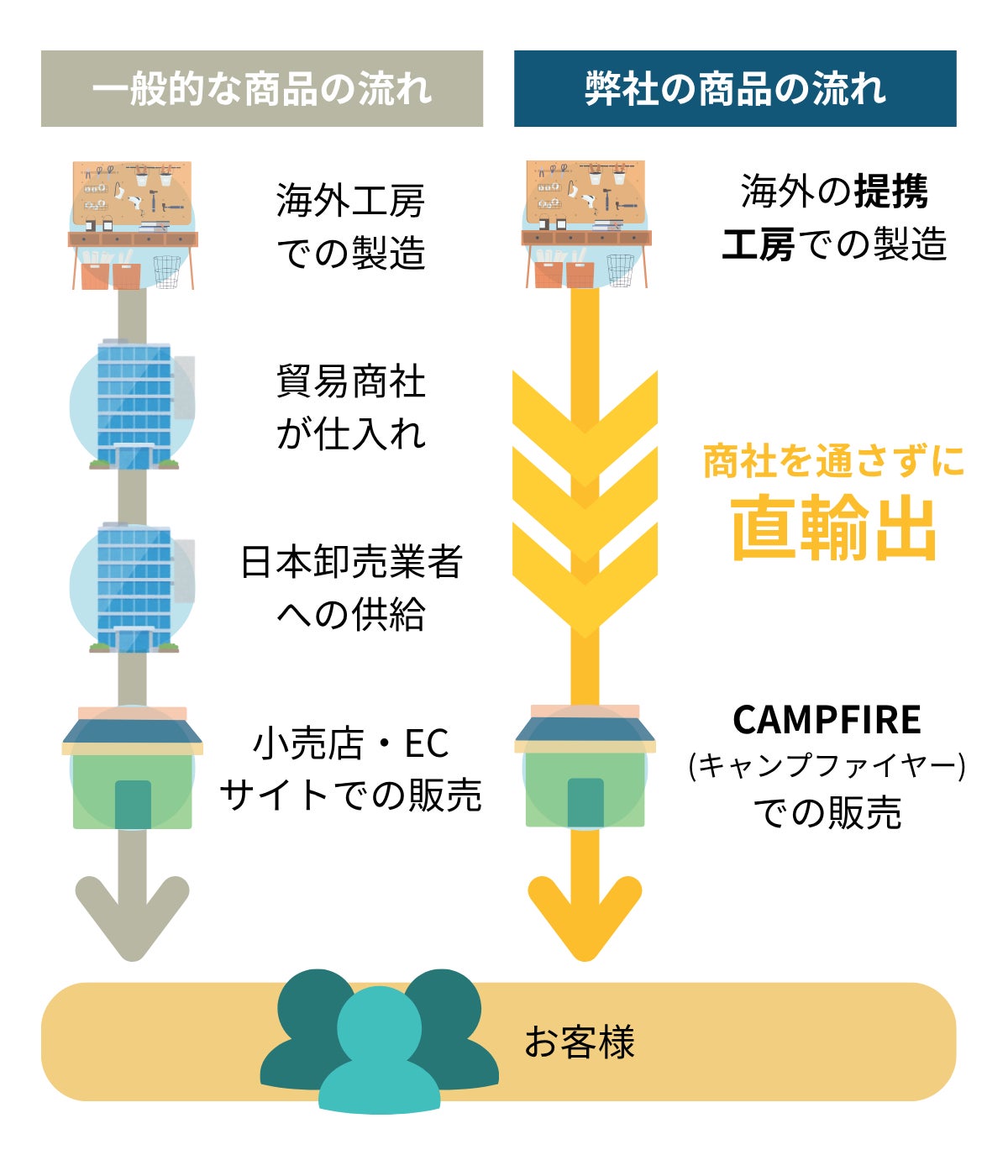 通常の流通では、1.海外工場での製造 → 2. 貿易商社が仕入れる →