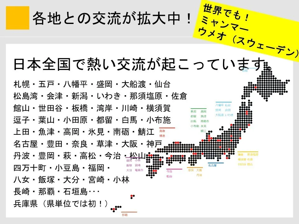 そしてカマコンの活動は鎌倉を飛び出して、各地に広がり続けています。これまでの累計で日本全国約50ヶ所、海外2ヶ所にカマコンブレストを核にした地域活動が立ち上がり、共感と行動のネットワークが築かれています。