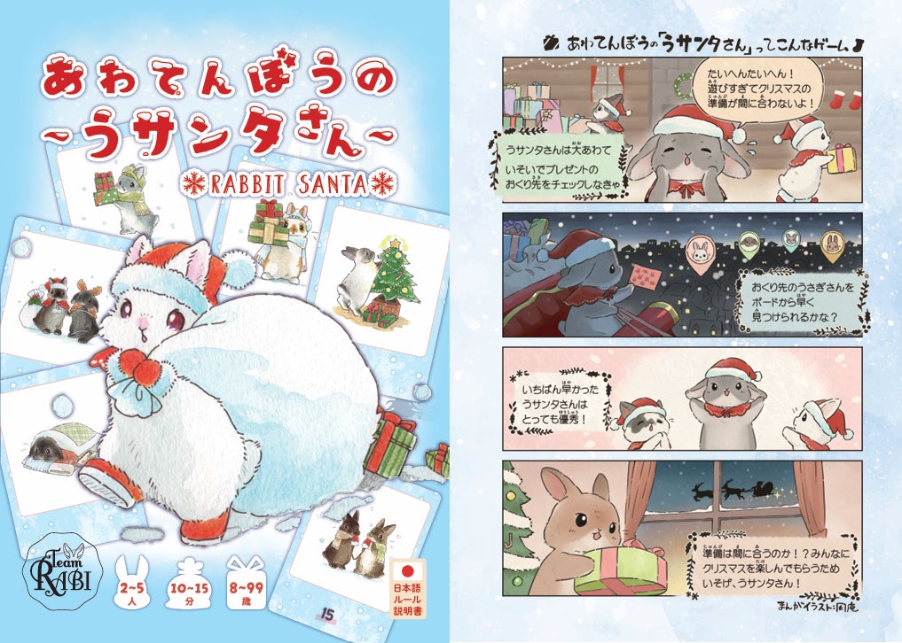 #うさぎトランプとTeamRABIの「あわてんぼうの~うサンタさん~」とお礼のメッセージの【特別セット】になります。「あわてんぼうの~うサンタさん~」はクリスマスまで怠けたうさぎのサンタになって、当日プレゼントの配り先のうさぎさんを急いで見つけるゲームです。