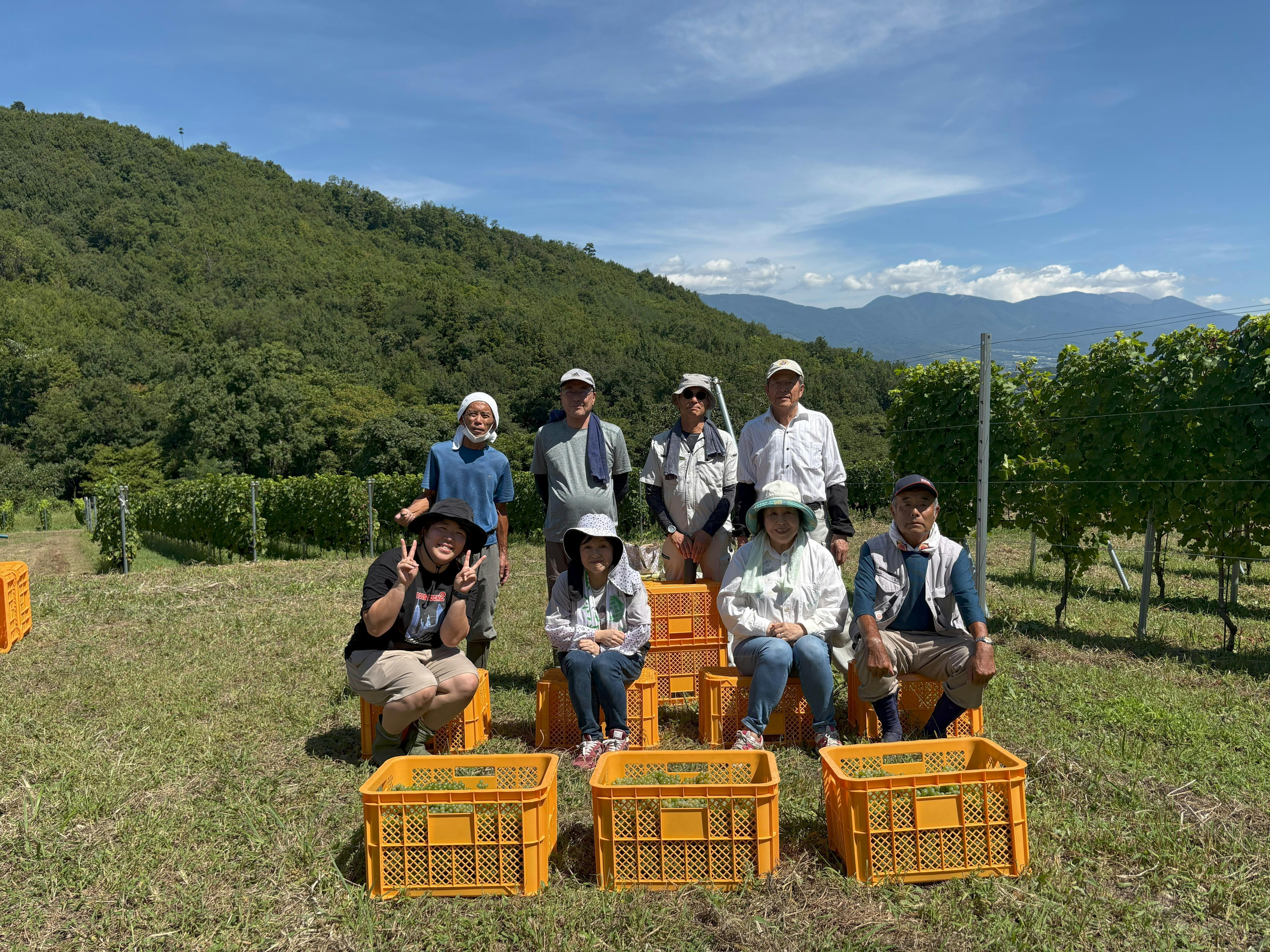 農業経験ゼロからのスタートでしたが、千曲川ワインアカデミーでの学びと、地域の皆さんとのご縁に助けられ、2022年にぶどうの苗を植えました。そして 2024年には、ついに赤白あわせて400kg超の初収穫を達成。