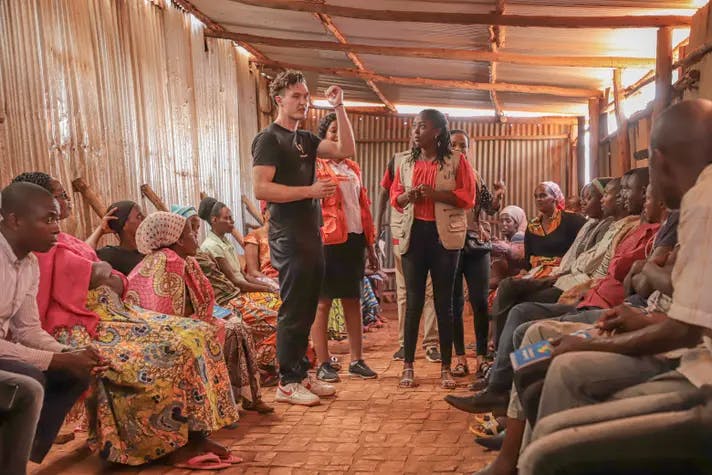 ↑アフリカのブルンジの民間キャンプでブレスレットを配布する創業者ロエル・バンデカープ。