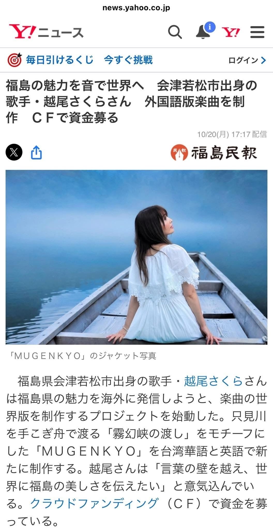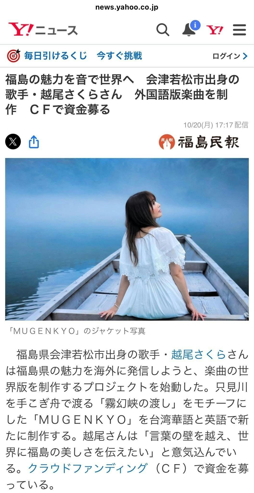 2025年10月20日(月)の福島民報新聞のMUGENKYO世界版制作の為のクラウドファンディングのネット記事がYahooニュースに掲載されました。