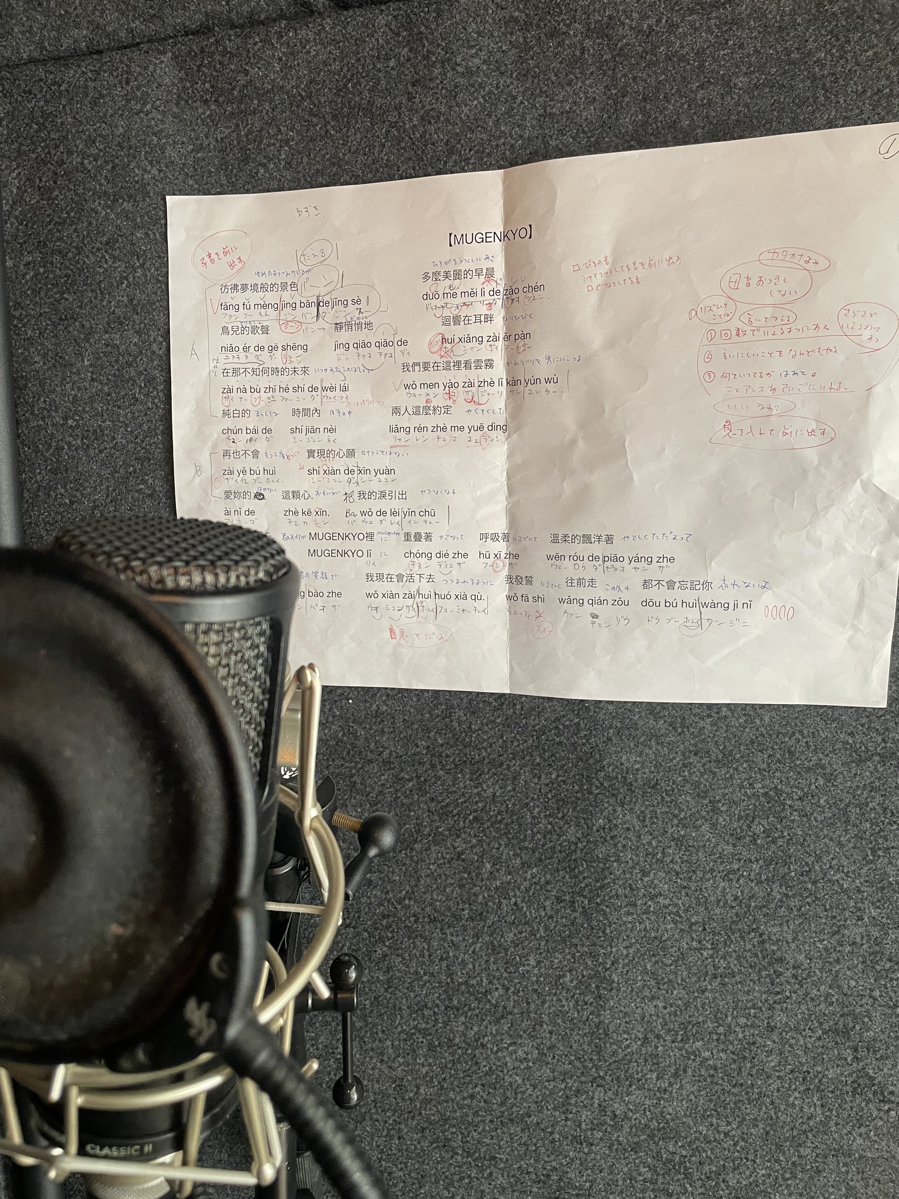 先日、ついにMUGENKYO台湾華語レコーディングの日を迎えました!このレコーディングの為に毎日曲と向き合って挑んだレコーディングでした。台湾ハーフのうちの姪、ねんど大介さん、私の歌の先生のまいこ先生が台湾華語や中国語が出来るので色んな方々のお力添えにより歌録り1日目が無事に終わりました!約2時間半のレコーディングでした。一曲入魂!!