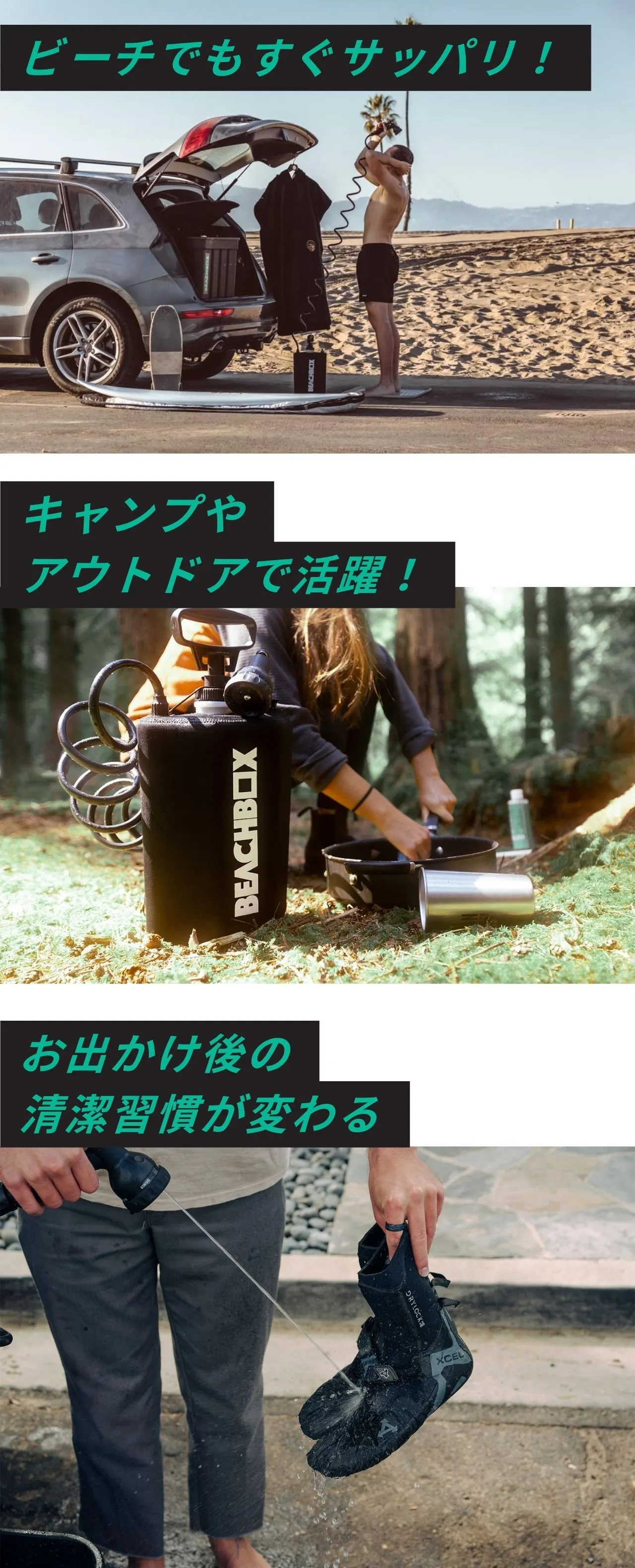 BeachBoxでは、ウォータースポーツ愛好家、アウトドアアドベンチャー愛好家、ビーチファミリー、ペットオーナー向けに、温水・冷水対応の断熱ポータブルシャワーとギア収納ボックスを設計しています。