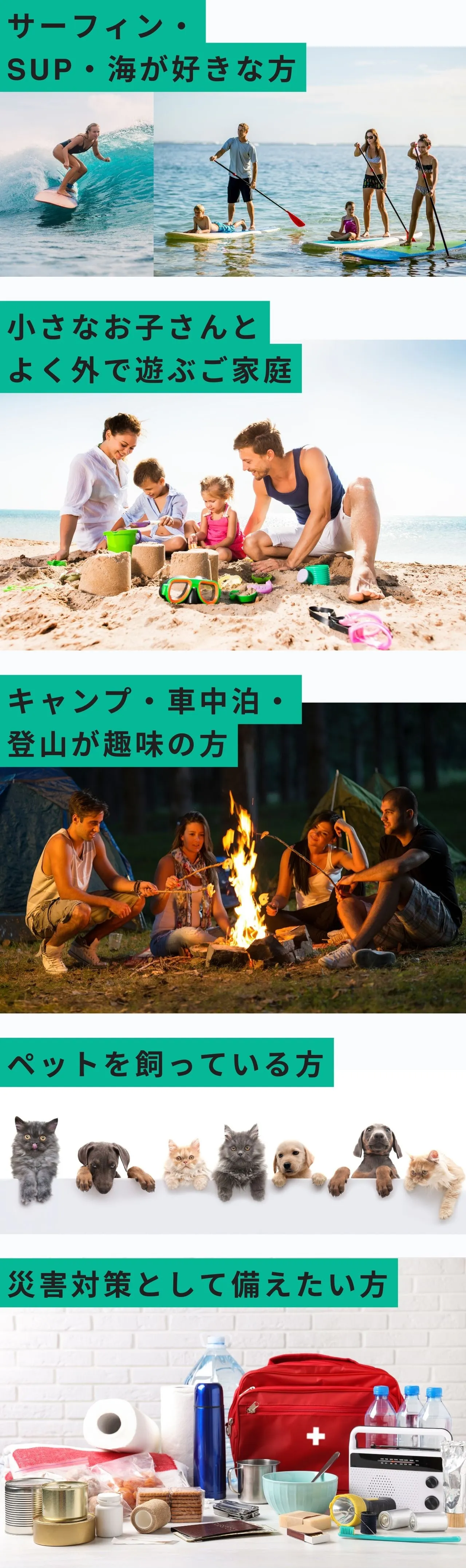 A. 電源や水道が不要なので、海、山、キャンプ場、車中泊、自宅の庭、災害時など、あらゆるシーンでご使用いただけます。