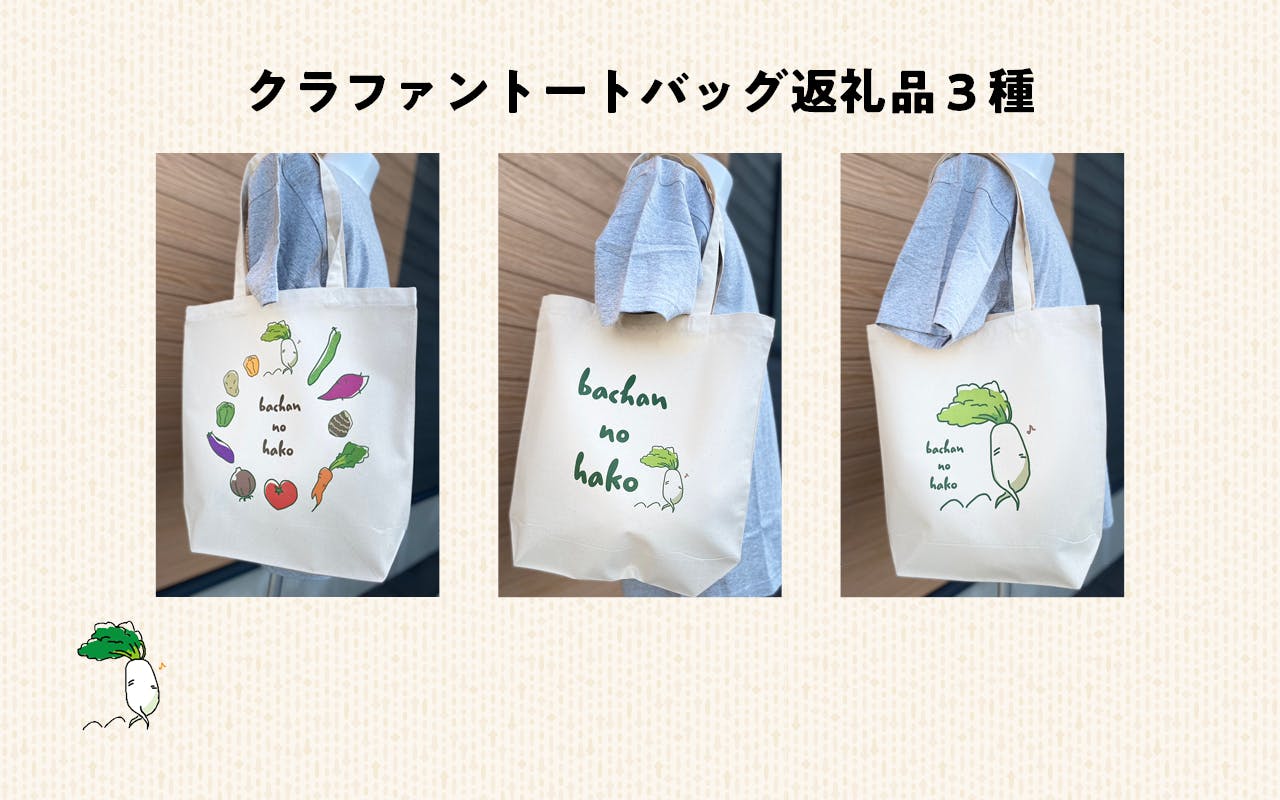 こんにちは、広島のばぁちゃんから届くハコです!現在、9名の方からご支援いただいています。ご支援くださった皆様、大変ありがとうございます!現場より、返礼品のサンプル写真が届きましたので準備の様子をお届けします。本日はTシャツです!返礼品として用意しているのは3種類、表・裏共にデザインの入ったものになっています。皆様はどのデザインが好きですか?ぴょんぴょん飛び跳ねる大根ちゃん、ハートにも見えるトマト…どれもかわいい…選ぶのにとても悩みますね。実は、こちらの印刷も弊社の福祉事業所の利用者様にお願いしています。働く機会や活動の場の提供として返礼品も貢献しています。そして、完成したものがこちら!トートバッグ、メモ帳も順次、作成予定です。また、サンプルが届き次第、ご報告いたします。よければ、お気に入り登録お願いします!