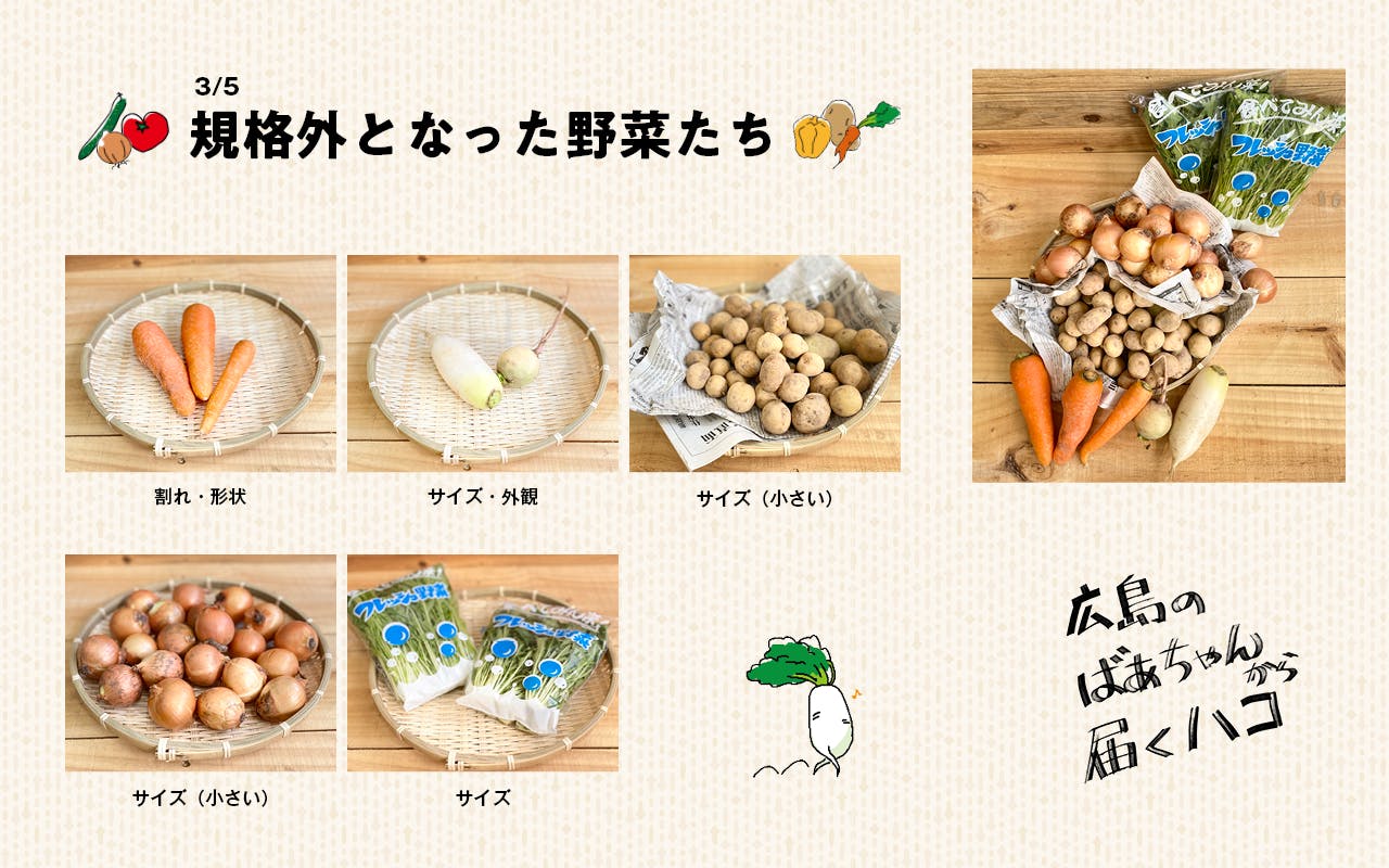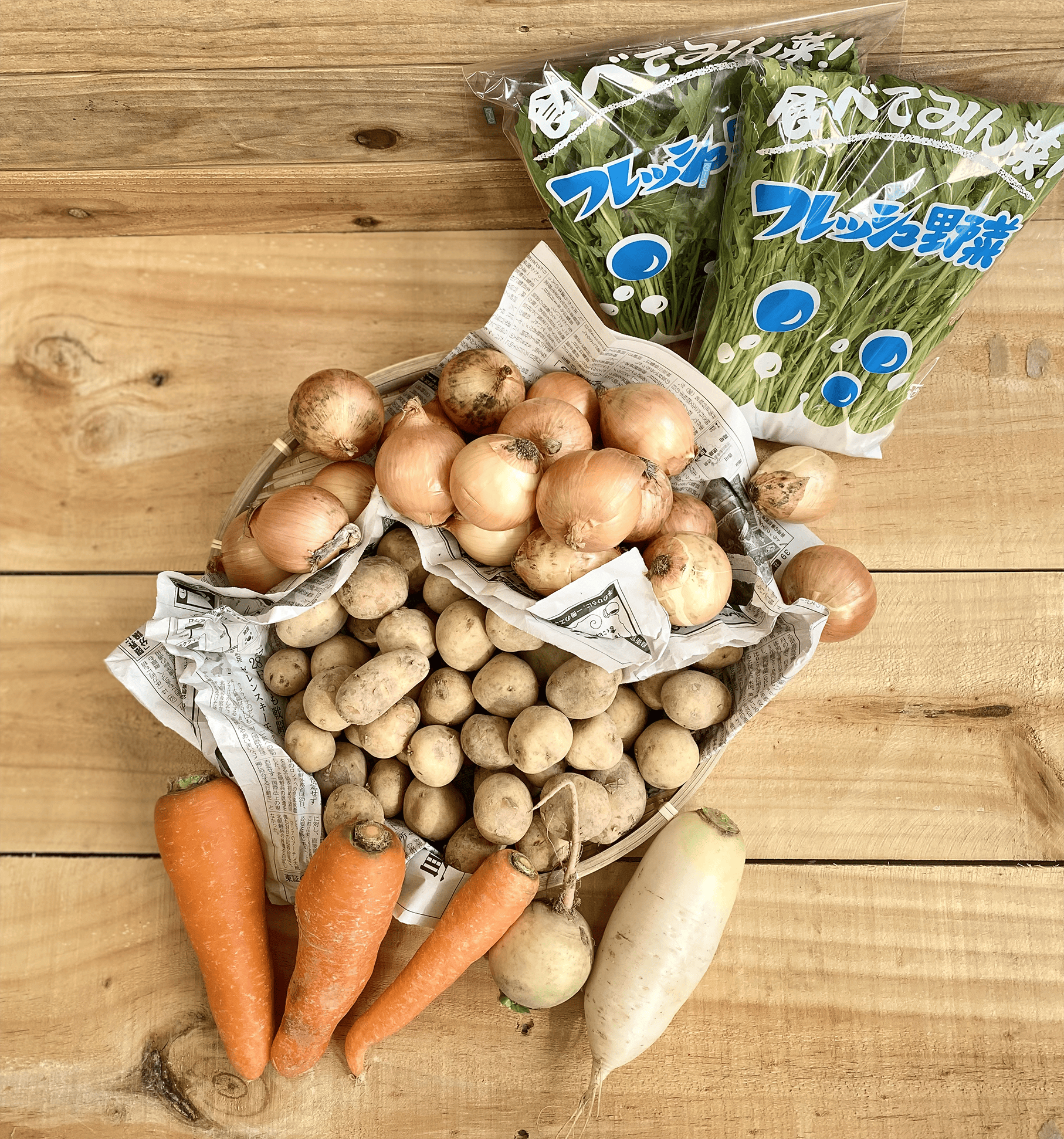 にんじん、大根、馬鈴薯、玉ねぎ、水菜になります。