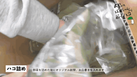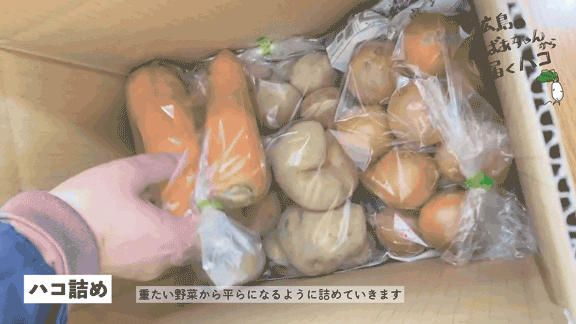 袋に入れた野菜を、発送中に動いて傷まないようにハコに詰めていきます。